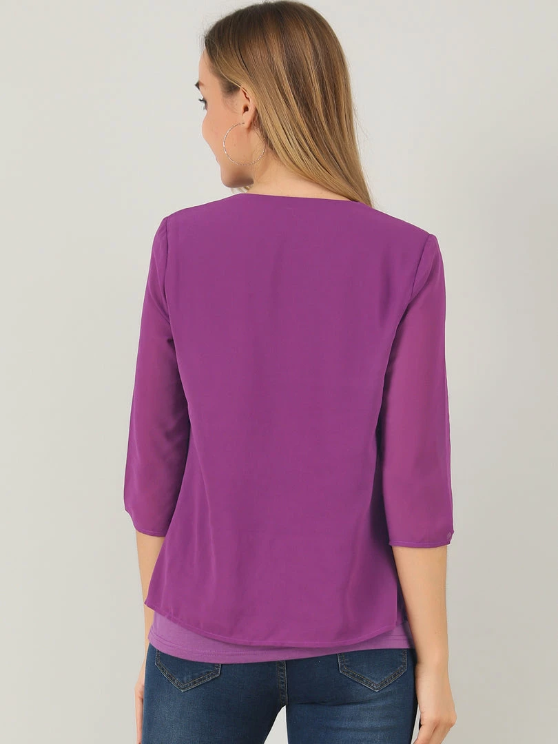 Allegra K Women’s Chiffon 3/4 Sleeve V Neck Overlay Blouse