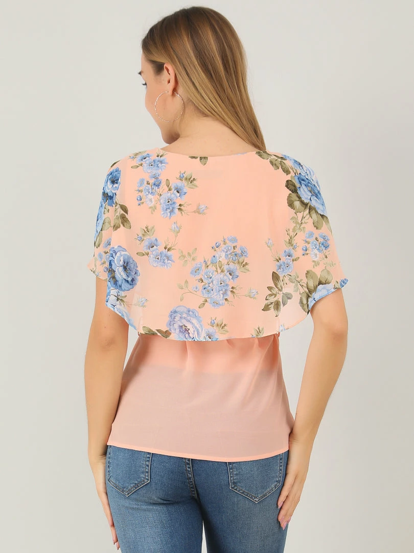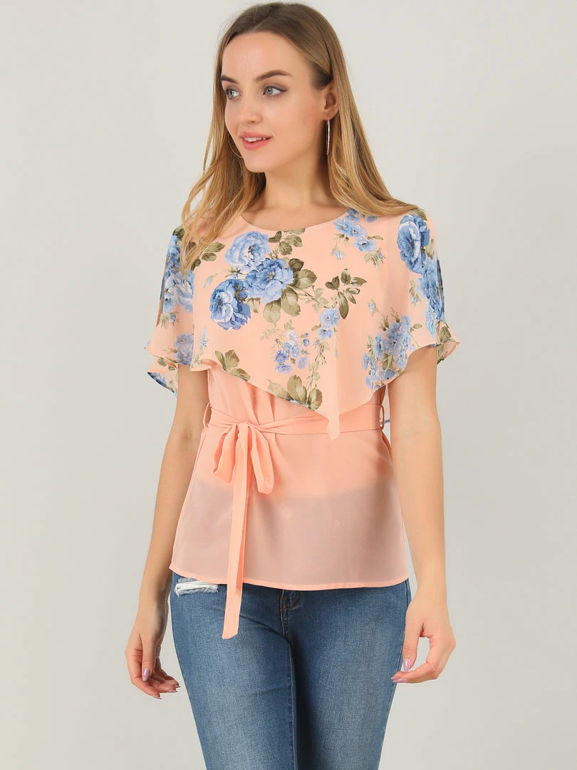 Allegra K Women’s Chiffon Belted Summer Layered Floral Blouse