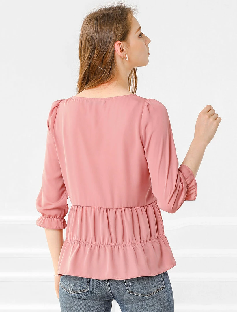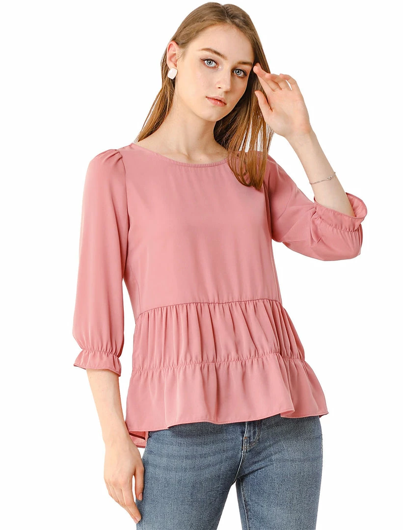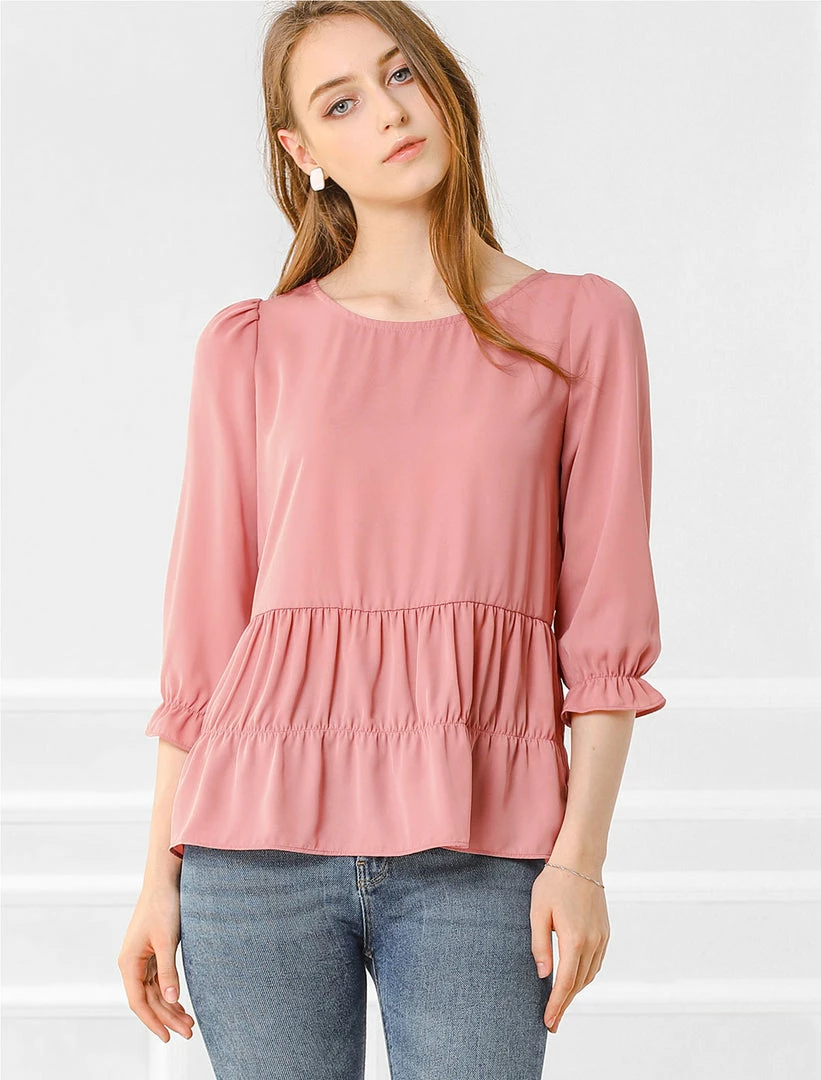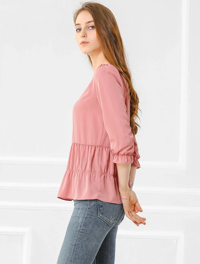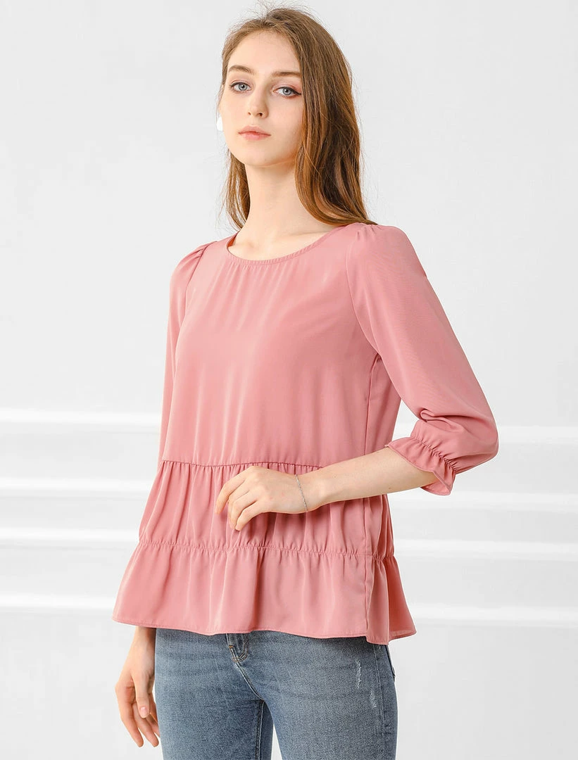 Allegra K Women’s Chiffon Puff 3/4 Sleeves Loose Layered Ruffle Hem Babydoll Blouse Top