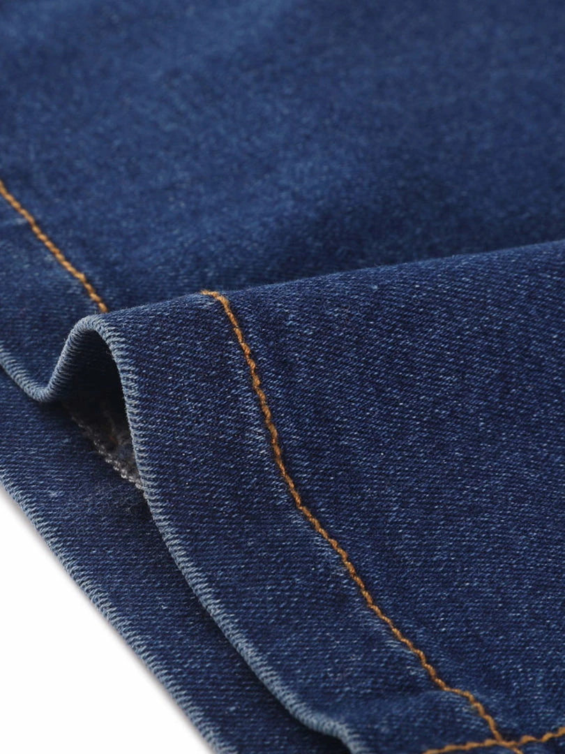 - Simple dark blue denim gives this A-line short suspender skirt that classic, vintage look.