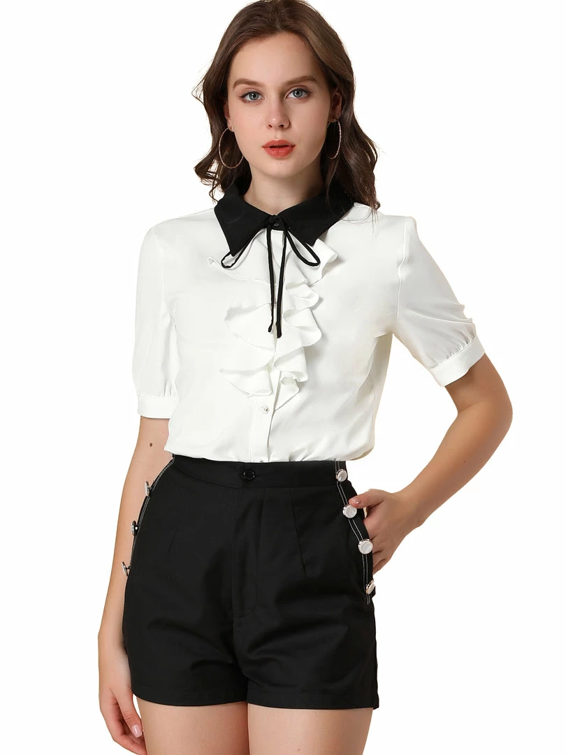 Allegra K Women’s Contrast Collar Tie Ruffle Front Button Short Sleeve Work Shirt