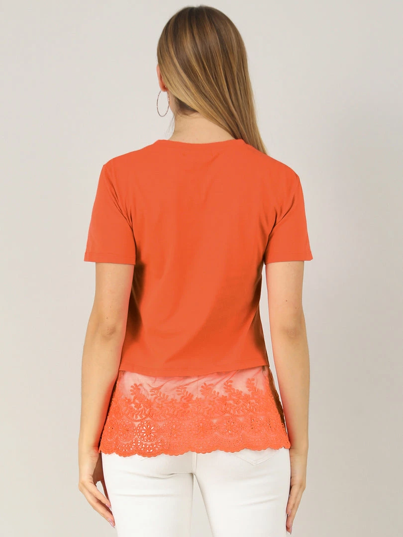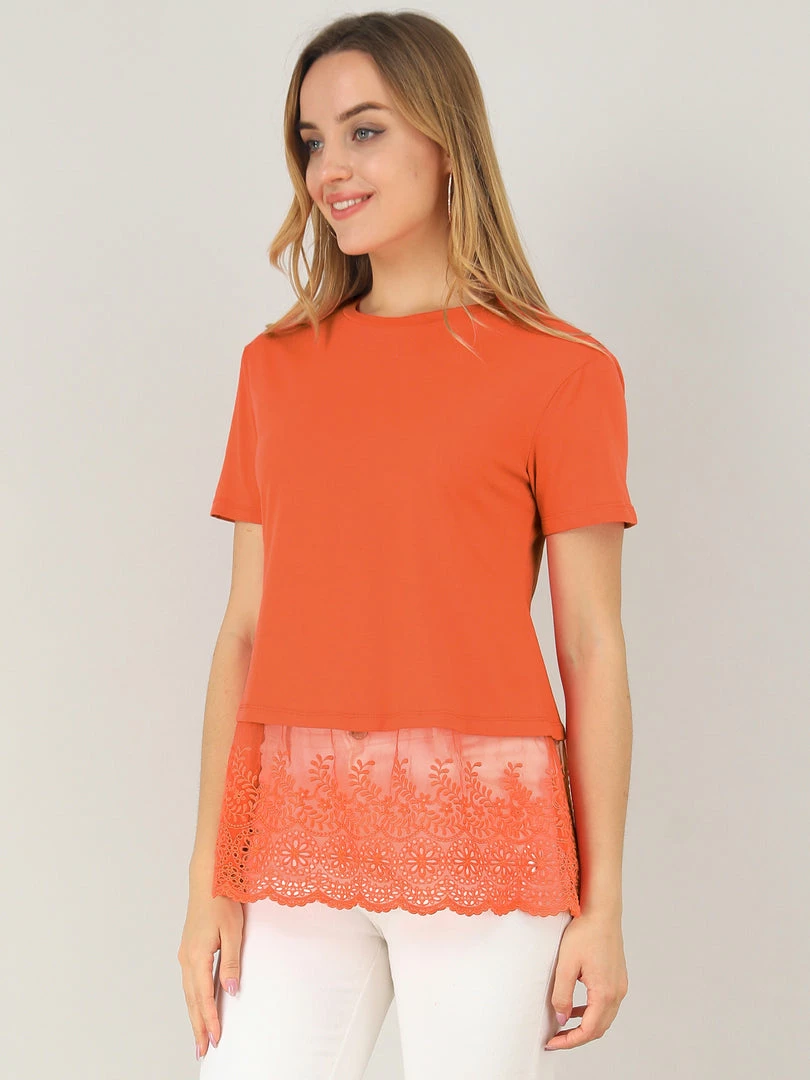 • Relaxed Fit, Tiered Blouse, Contrast Lace Panel, Crew Neck, Round Neckline, Short Sleeve, Stretchy Knit Fabric