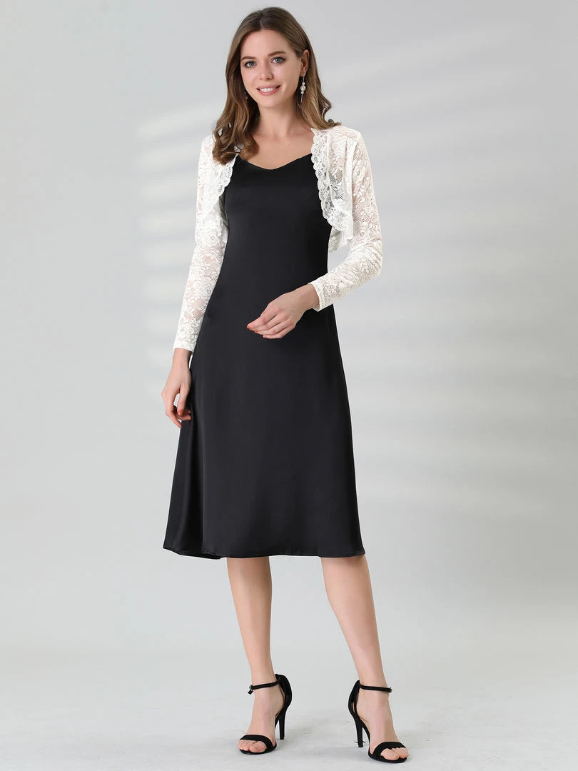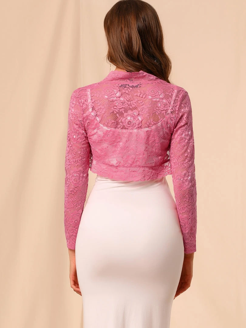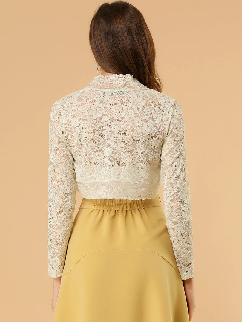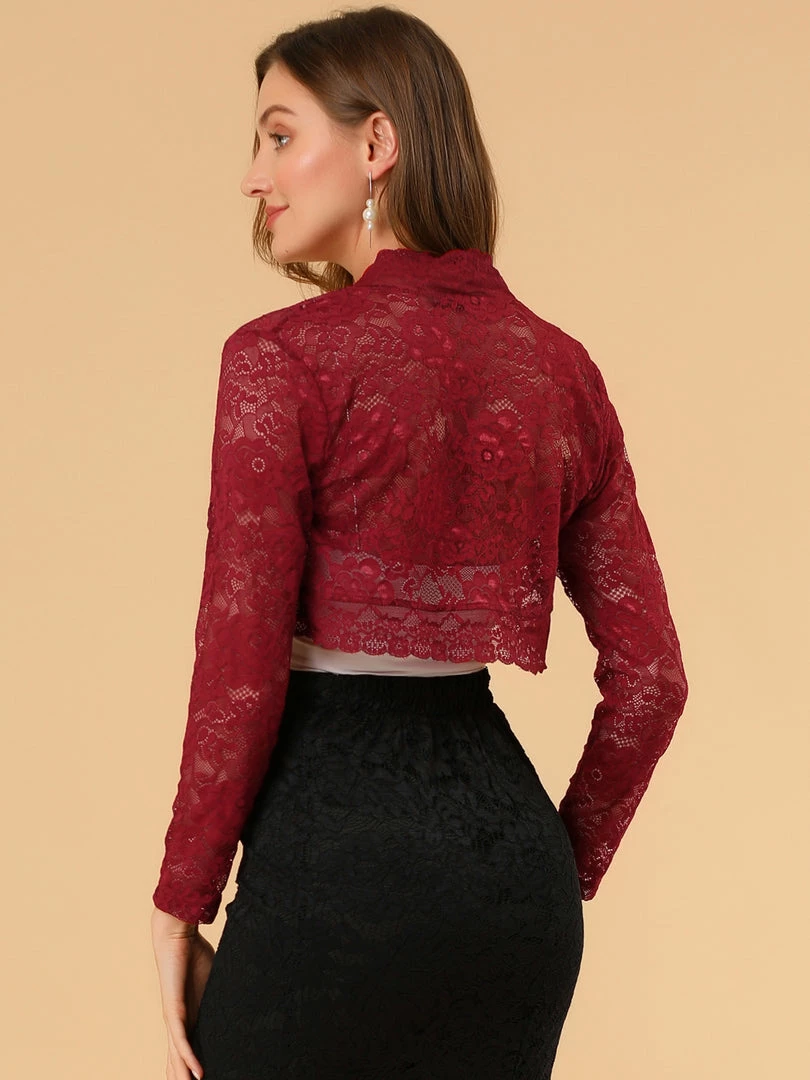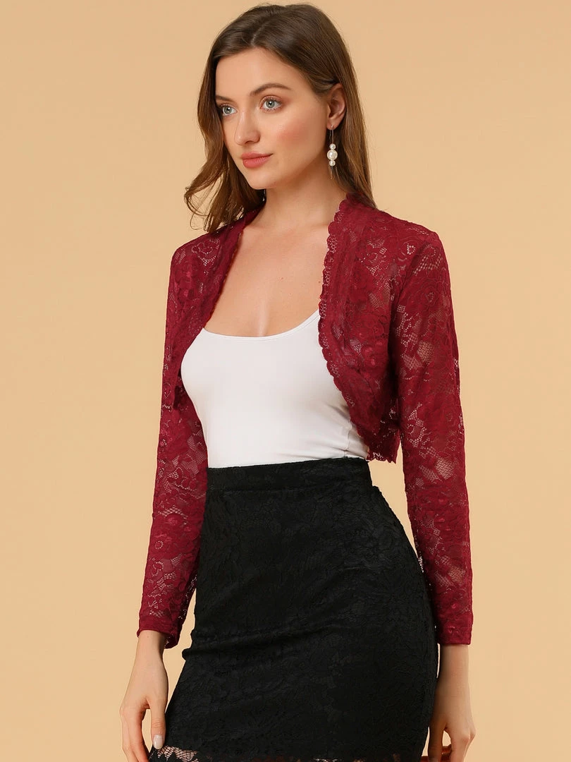 - A must have in your clothing wardrobe, The lace bolero has long sleeves, semi-sheer lace, and finished with a cropped length and could be stretchy a bit.