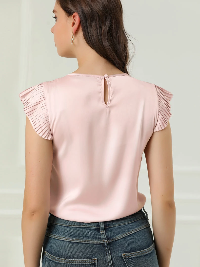 Allegra K Women’s Cut Out Keyhole Back Straight Solid Pleated Cap Sleeve Blouse