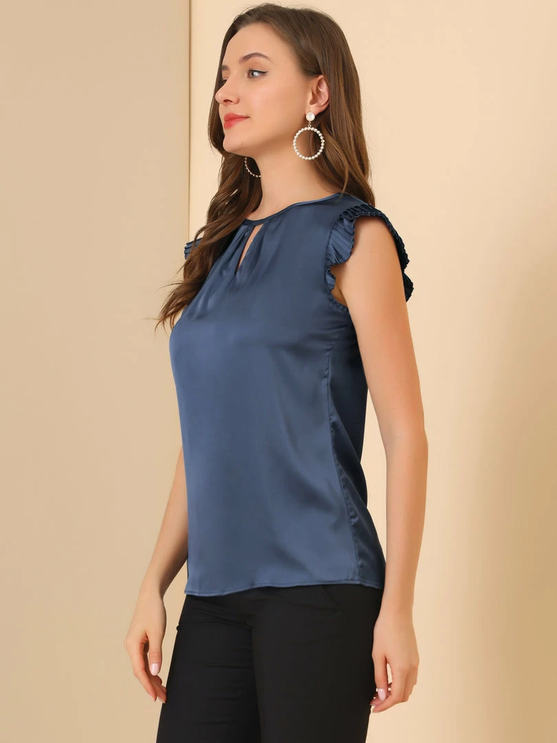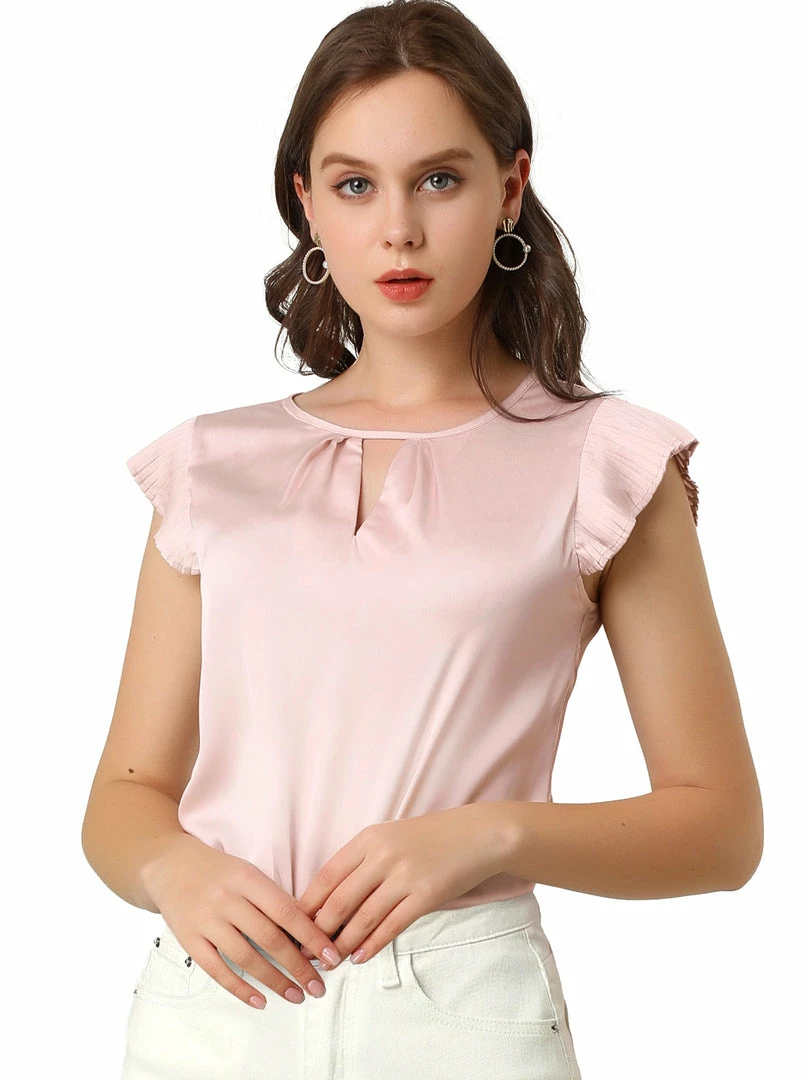 - Simple and nice, this blouse features cut out front, keyhole back, solid color, and pleated cap sleeve.