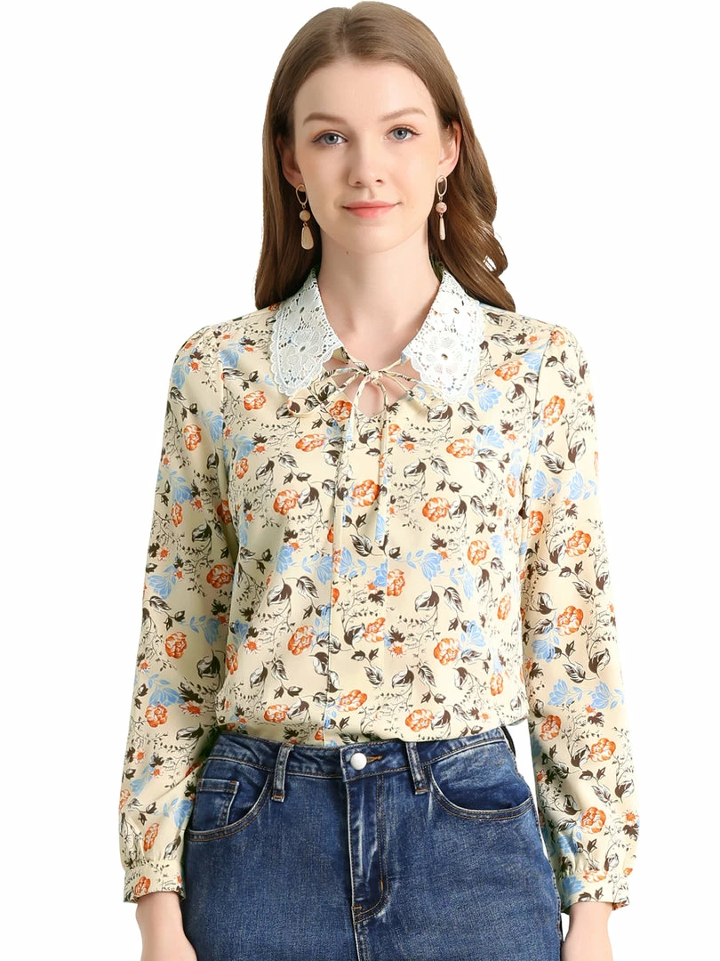 - It bows tie the front and is designed in attractive tailoring, this smart lace collar blouse is designed with an easily curved hem showing your elegance.