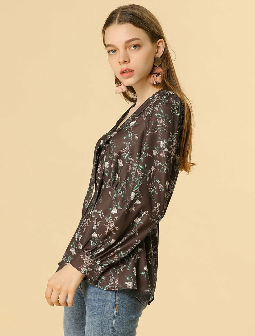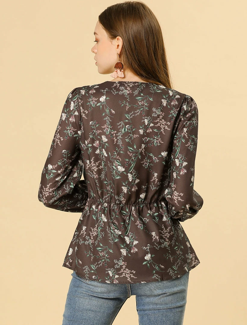 Allegra K Women’s Deep V Neck Long Sleeves Tie Front Floral Peplum Top