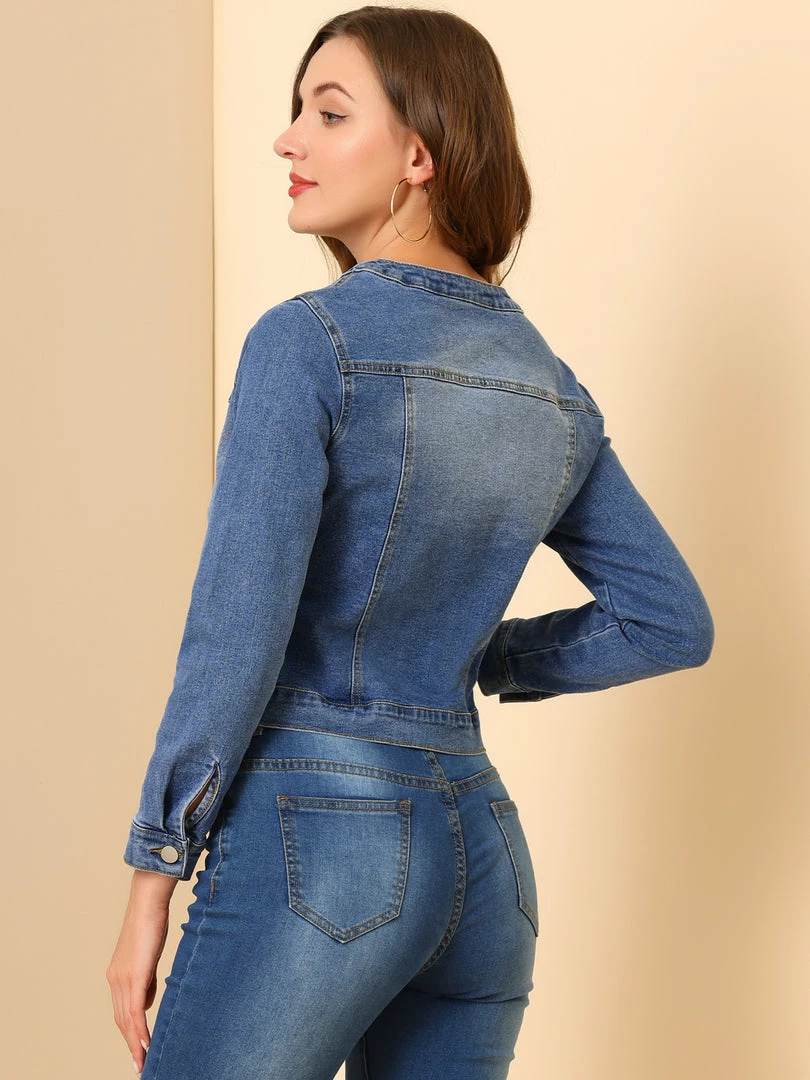 Allegra K Women’s Denim Jacket Button Down Collarless Long Sleeve Jean Jackets