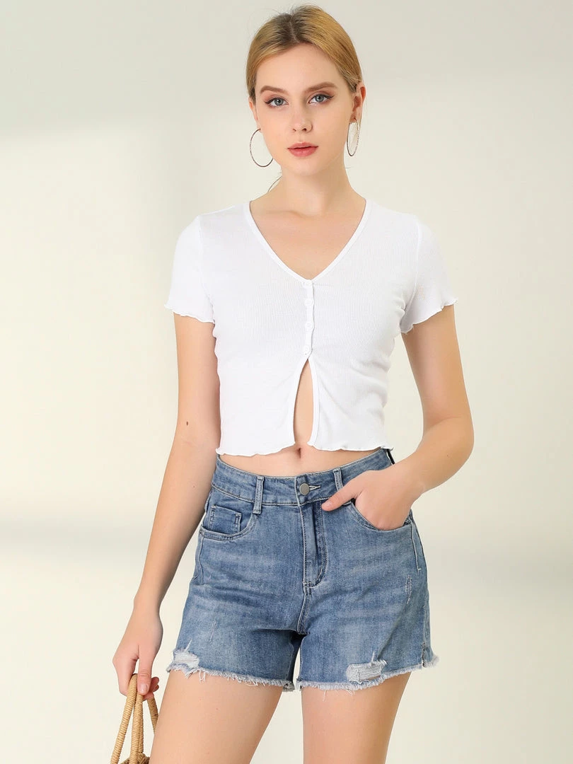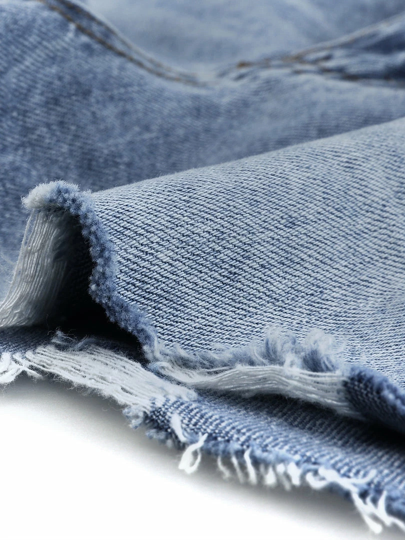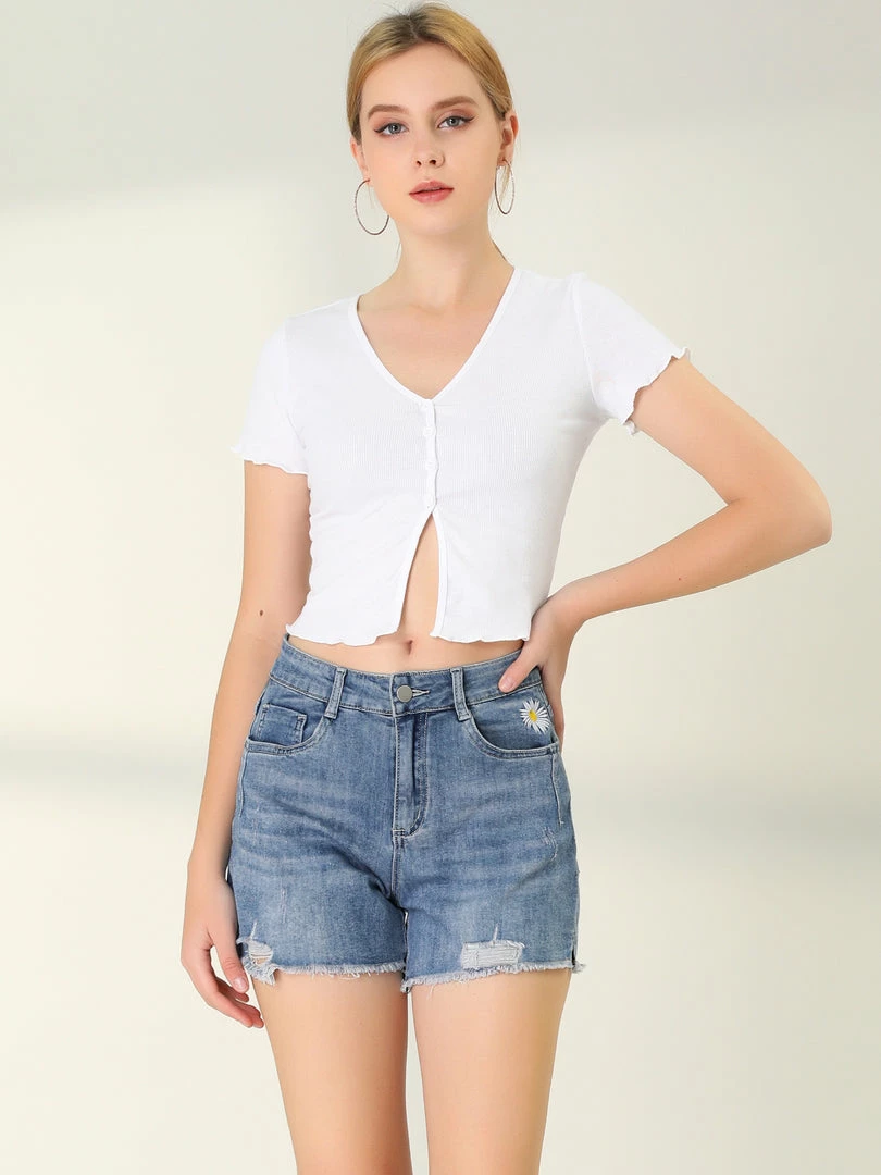 - This fashion denim shorts feature a traditional five-pocket silhouette with a mid-rise fit, frayed raw hem, and embroidered flower.