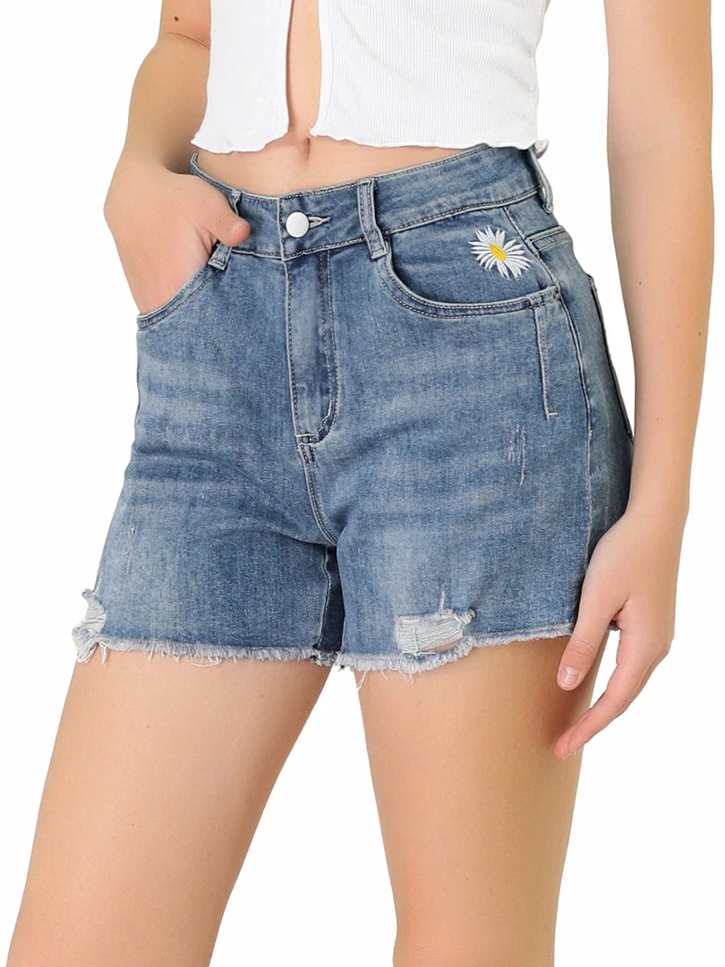 Allegra K Women’s Denim Shorts Frade Frayed Hem Ripped Daisy Floral Summer Jeans