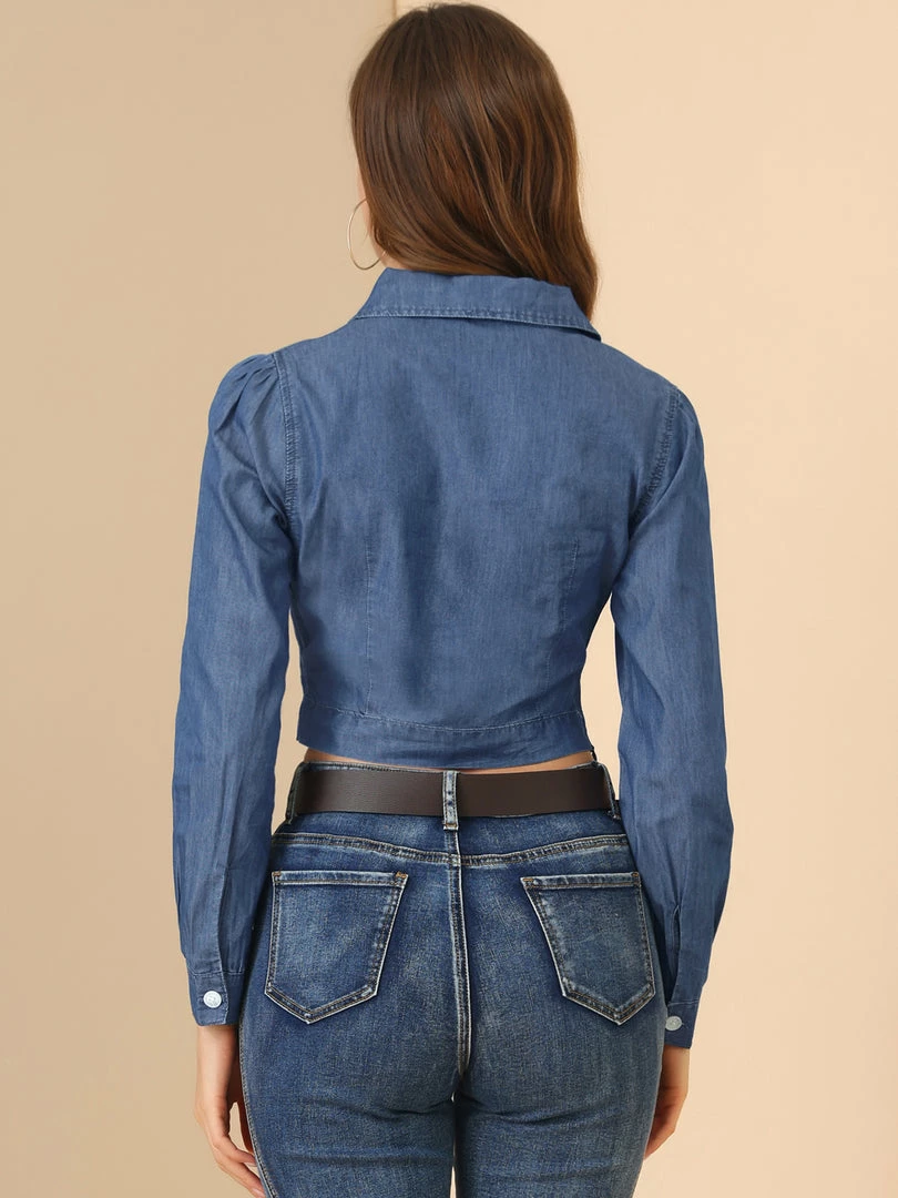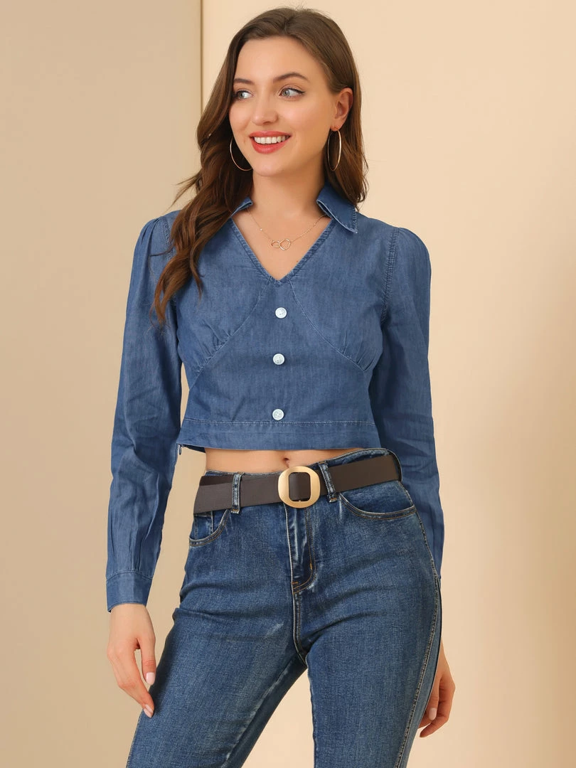 Allegra K Women’s Denim Top V Neck Button Cuff Button Down Blouse