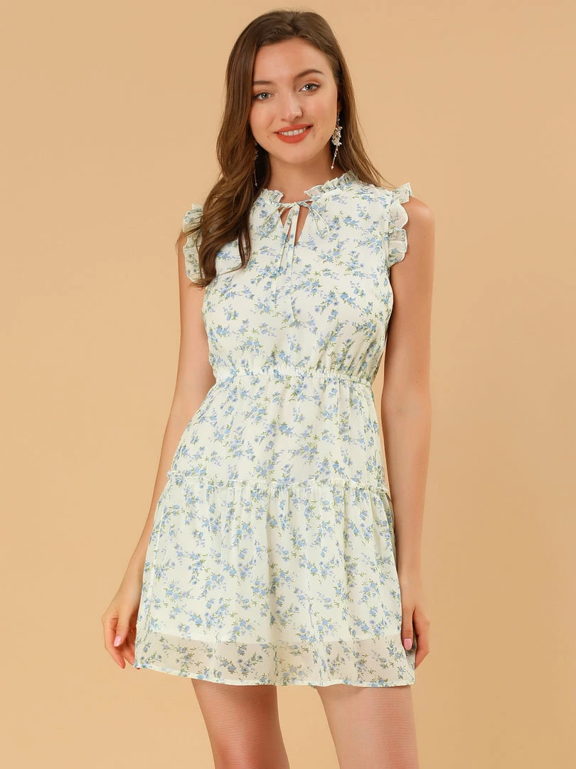 Allegra K Women’s Ditsy Floral Ruffle Neck Bow Tie High Waisted A Line Sleeveless Dress