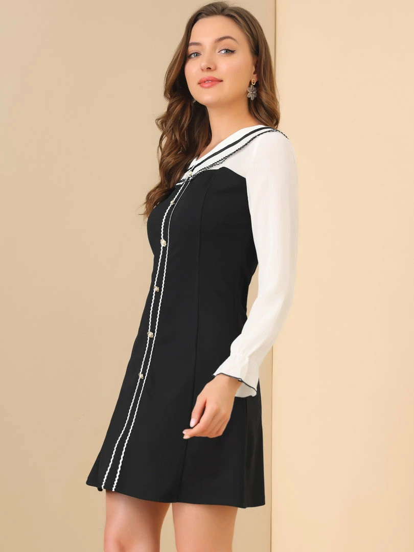 Allegra K Women’s Doll Collar Cute Color Block Lond Sleeve Stretchy A-line Dress