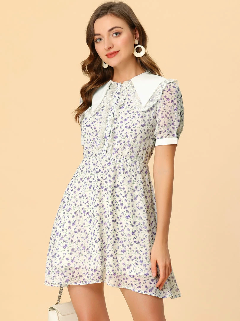 Allegra K Women’s Doll Collar Lace Decor Button Up Floral Dress