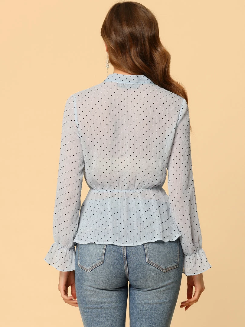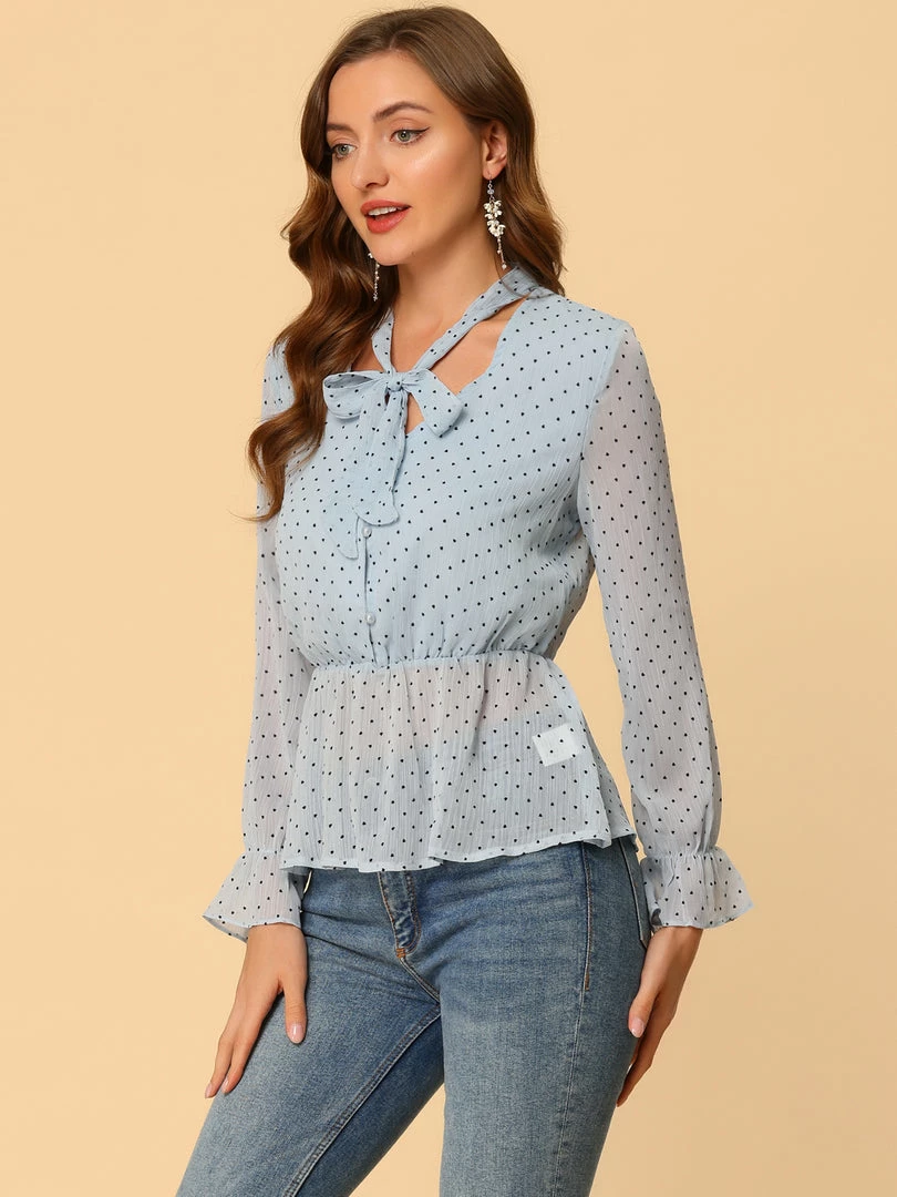 Allegra K Women’s Dots Peplum Shirt Ruffle Cuff Semi Sheer Bow Tie Neck Blouse