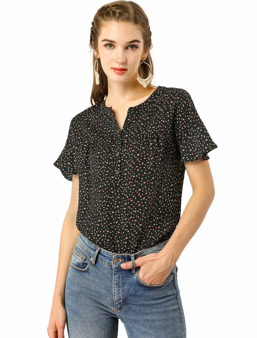 Allegra K Women’s Dots Printed Ruffle Sleeve Henley Button Down 1950s Vintage Blouse Tops