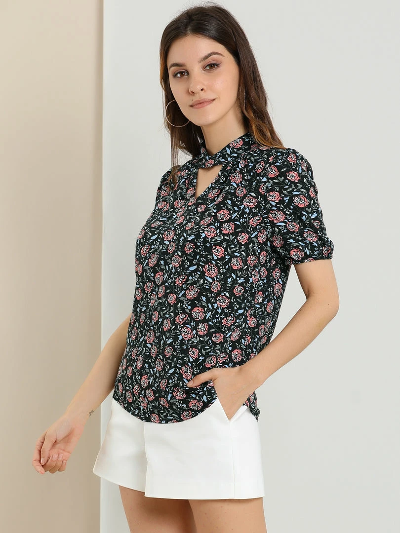 Allegra K Women’s Elegant Floral Puff Short Sleeve Stand Collar Keyhole Blouse Tops