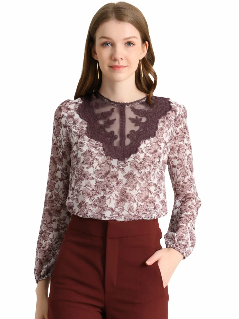 Allegra K Women’s Elegant Lace Panel Long Sleeve Chiffon Floral Blouse Tops