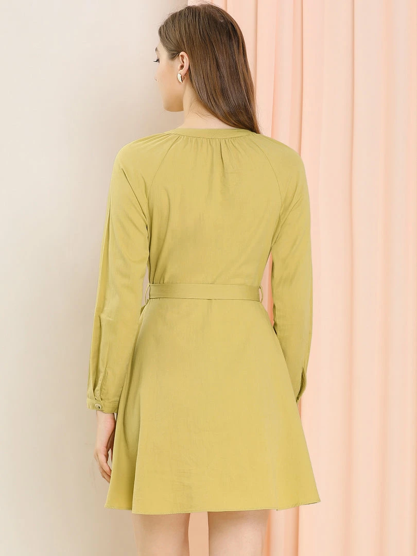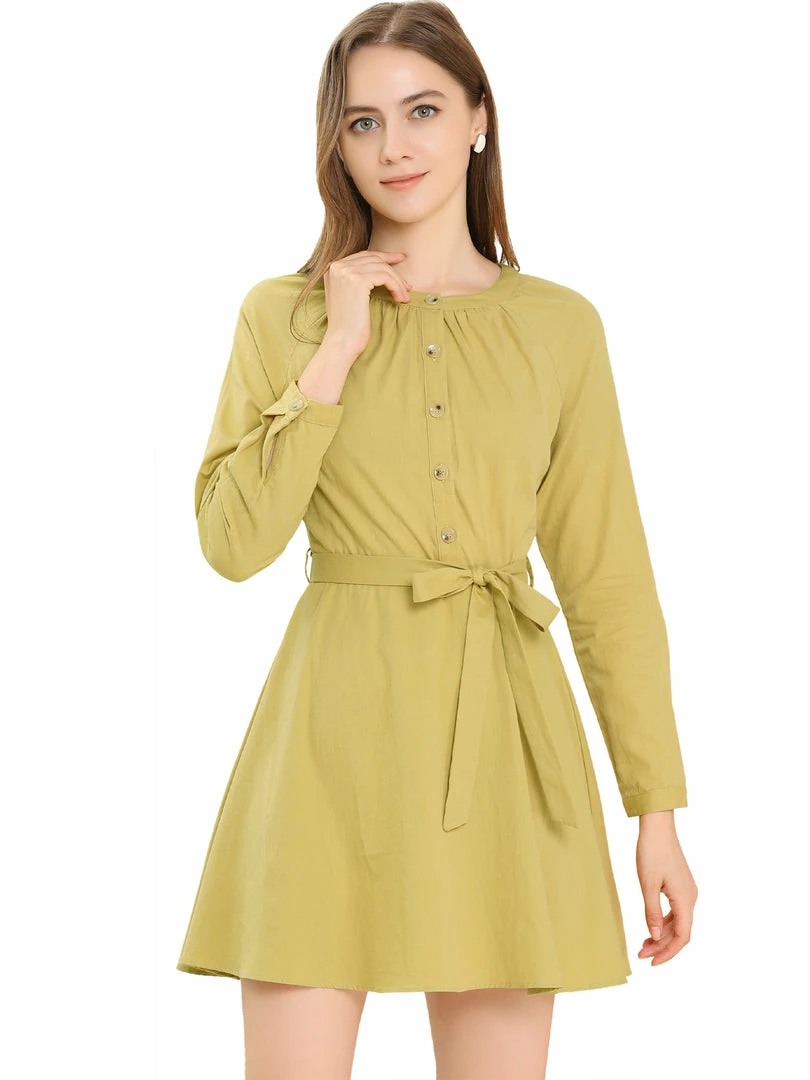 Allegra K Women’s Elegant Long Sleeve Round Neck Tie Waist Belted Mini Button Down Dress