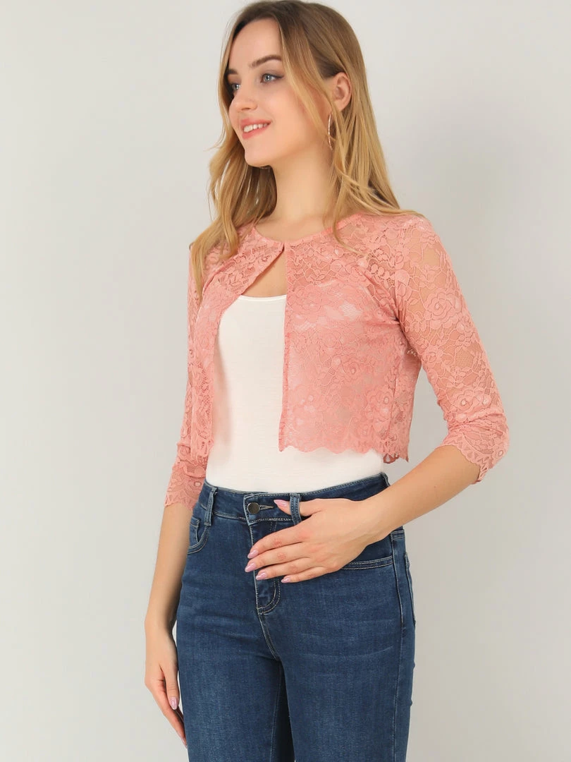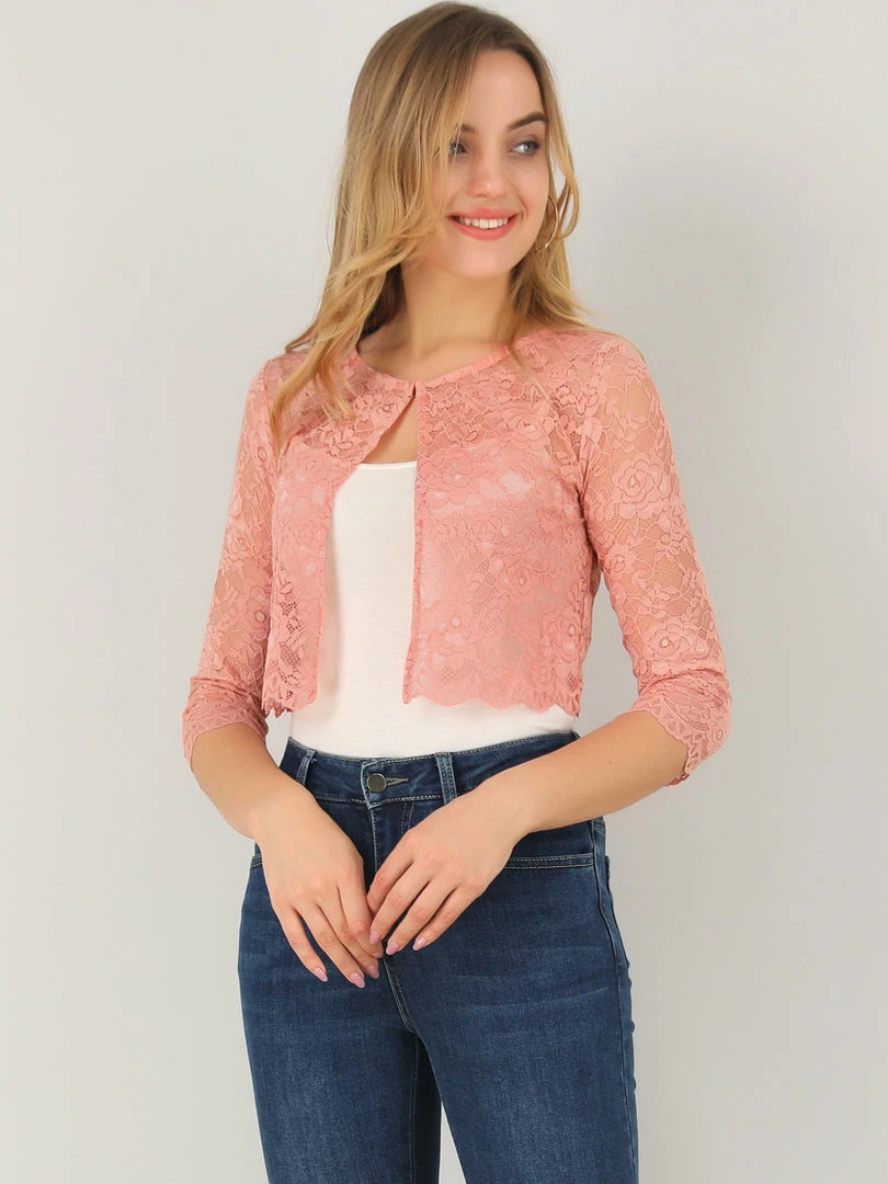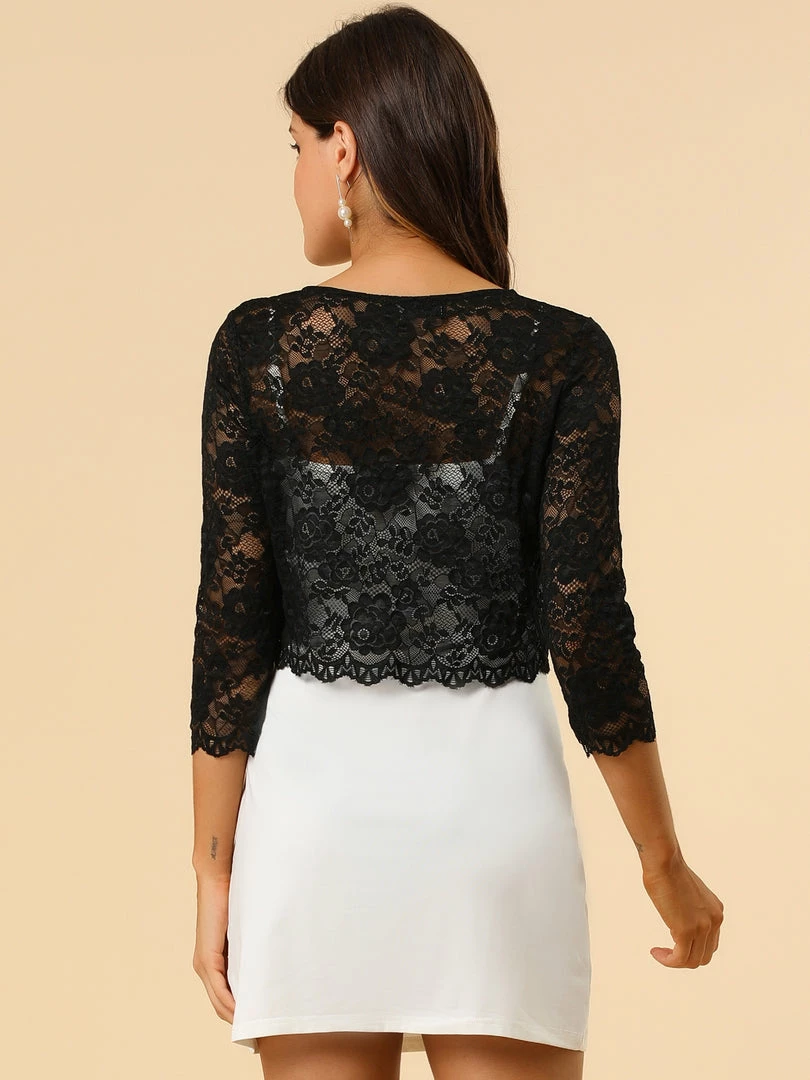 Allegra K Women’s Elegant Ruffle Collar Crop Cardigan Sheer Floral Lace Shrug Tops