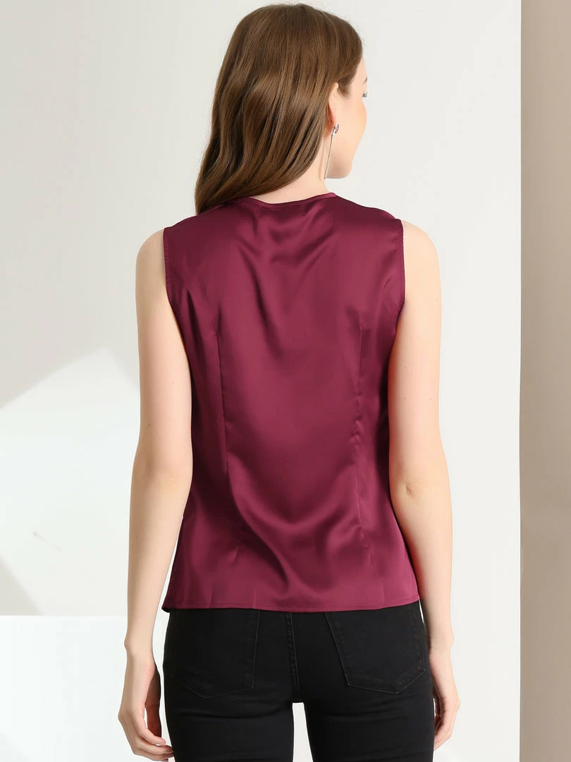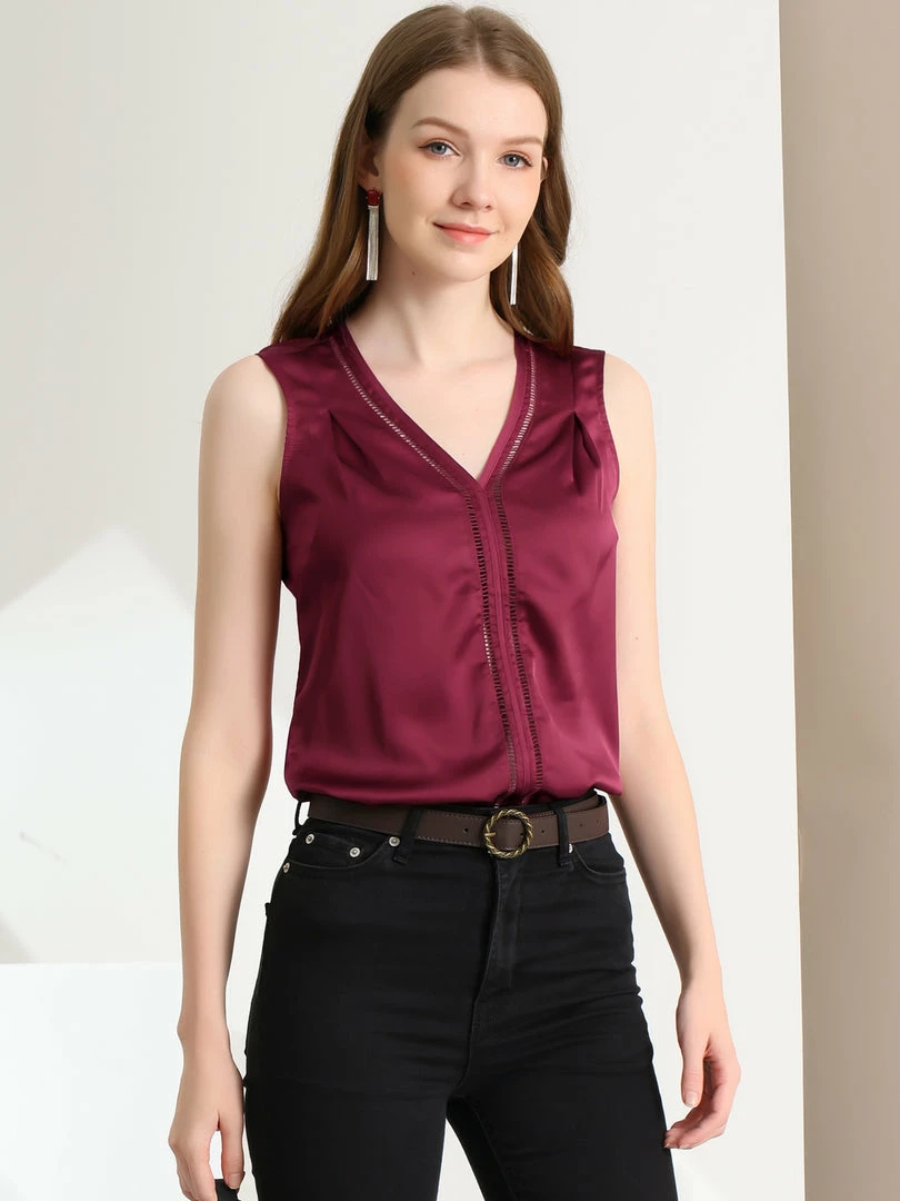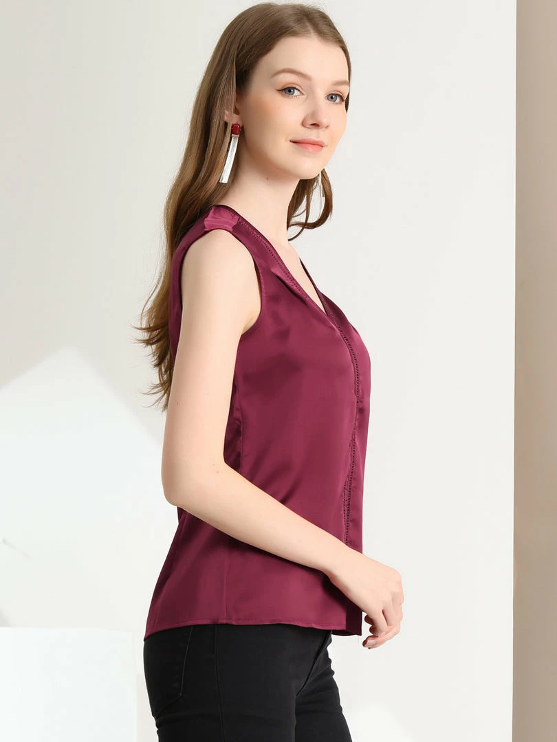 Allegra K Women’s Elegant Satin Blouse Work Office Top Hollow Out V Neck Sleeveless Shirt
