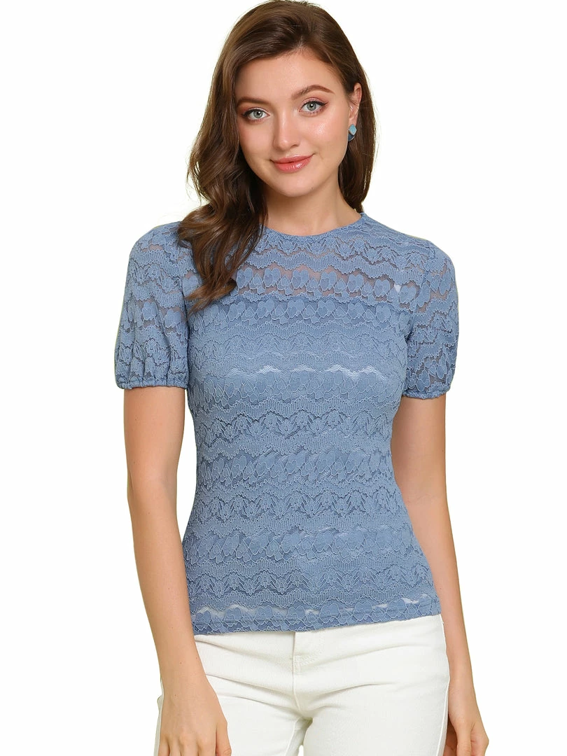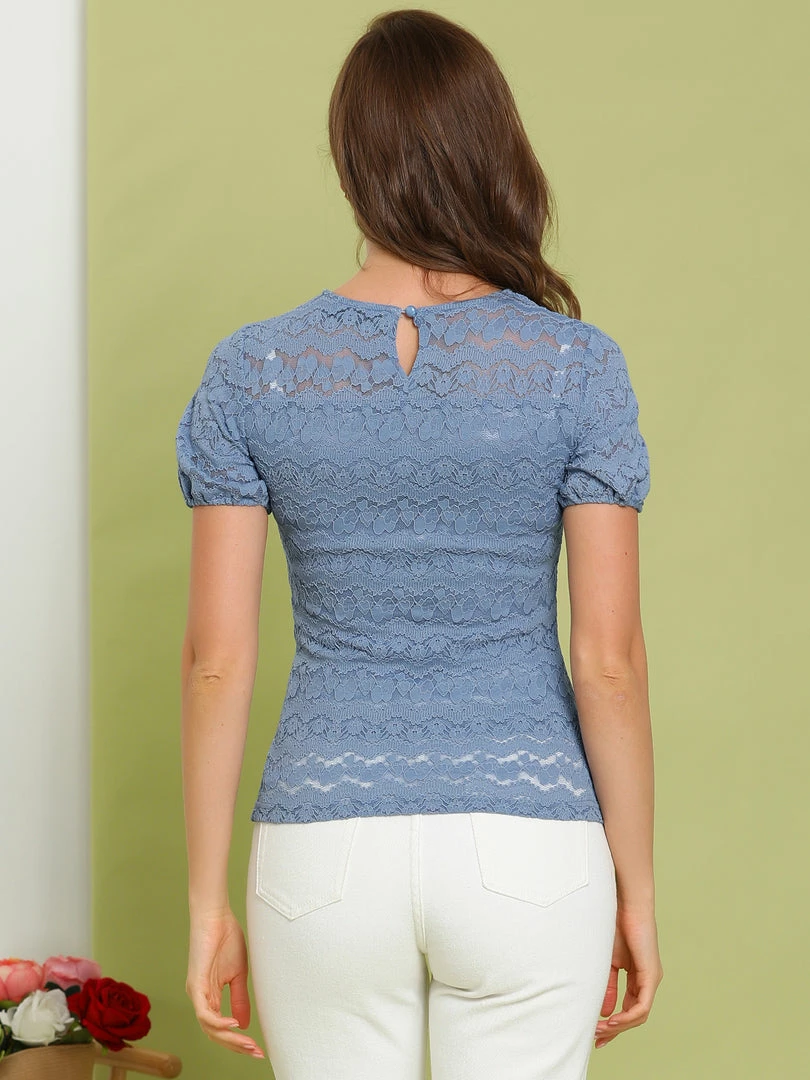 Allegra K Women’s Elegant Semi Sheer Short Sleeve Embroidery Blouse Lace Top
