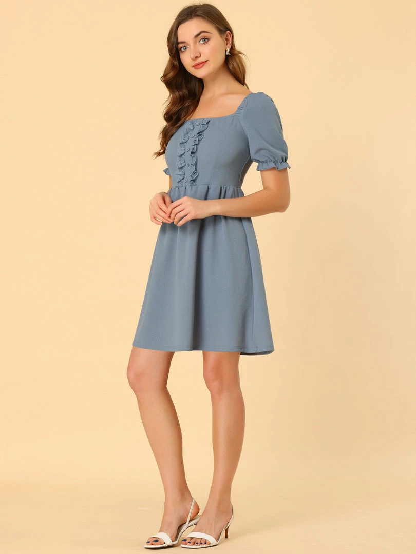 - Romantic square neck sweeten this lightweight dress styled with  puff short sleeves and ruffle cuffs.