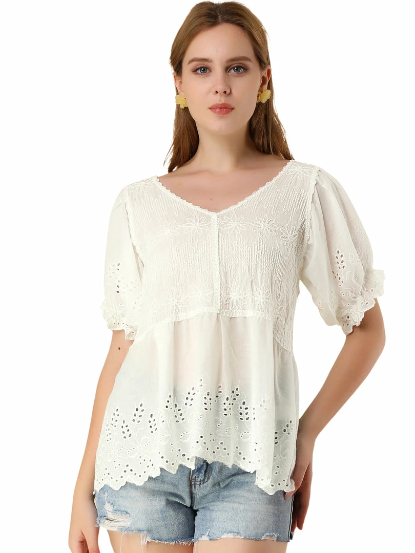 Allegra K Women’s Eyelet Blouses Howllow Out V Neck Puff Sleeve PeplumTop