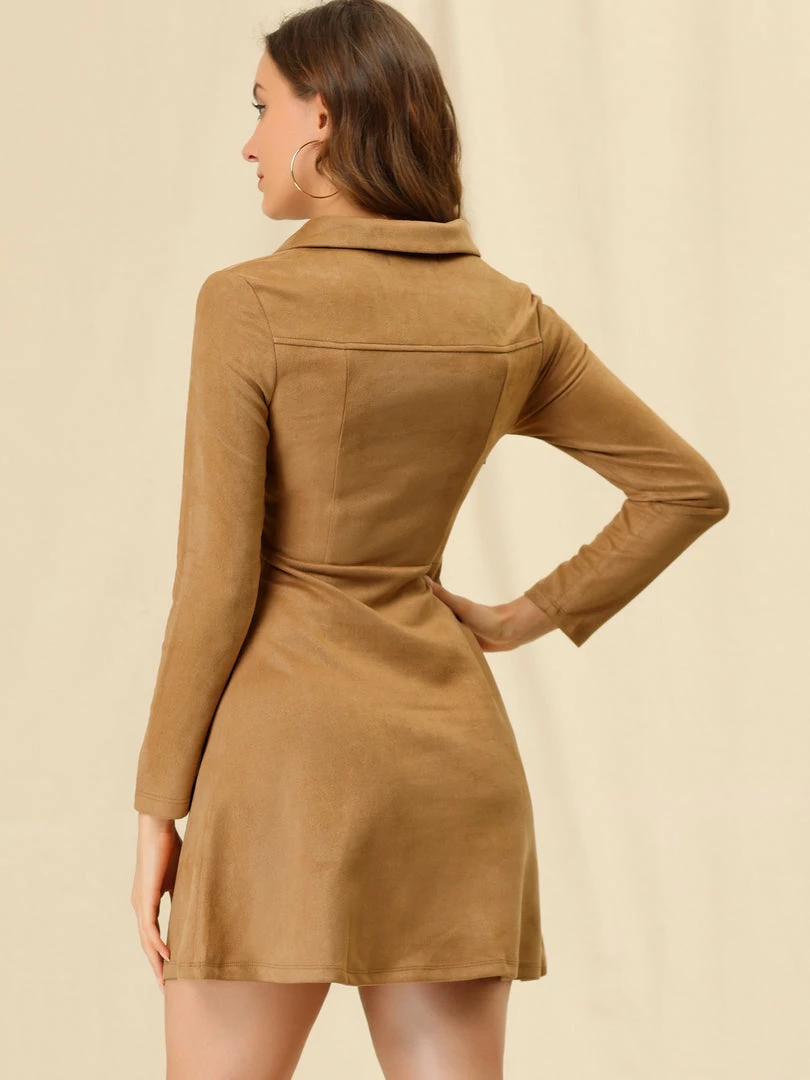 Allegra K Women’s Faux Suede Lapel Neck Long Sleeve A-Line Dress
