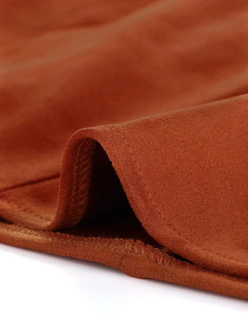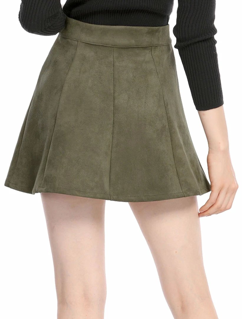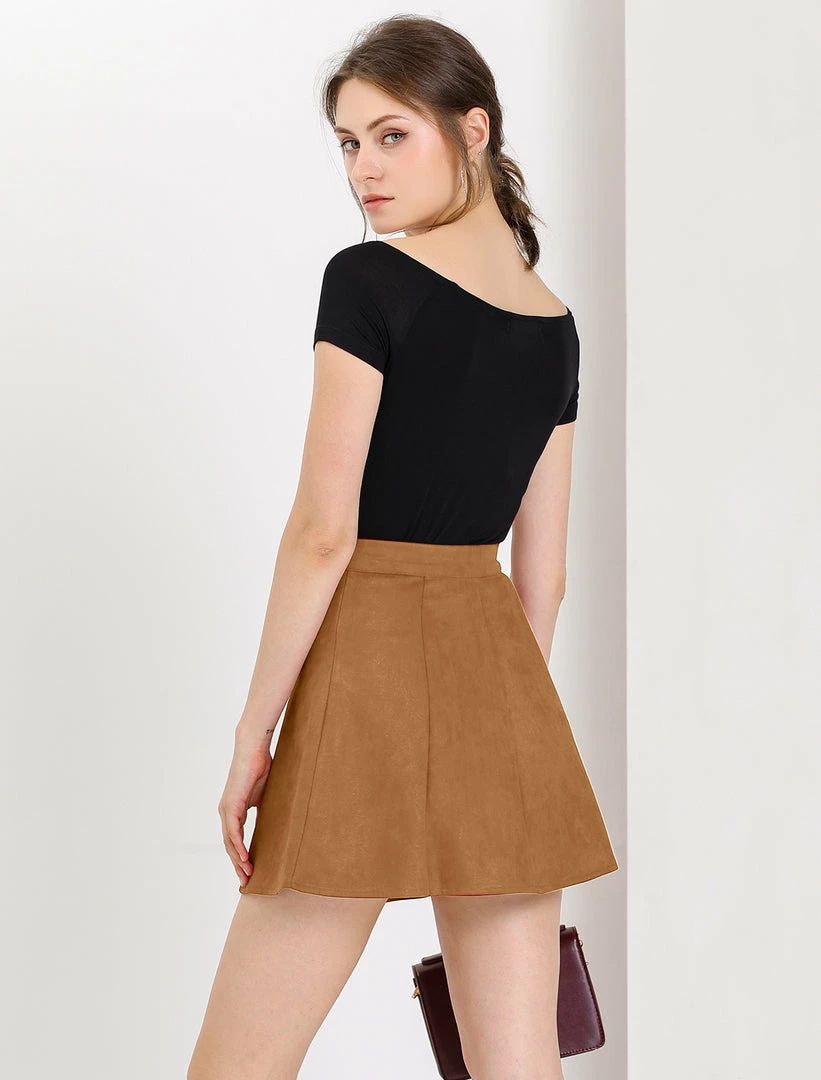 • Sleek, simple and short, a skirt exudes 70s-style charm thanks to wide panels of soft suede, exposed button closure and vintage coloring.