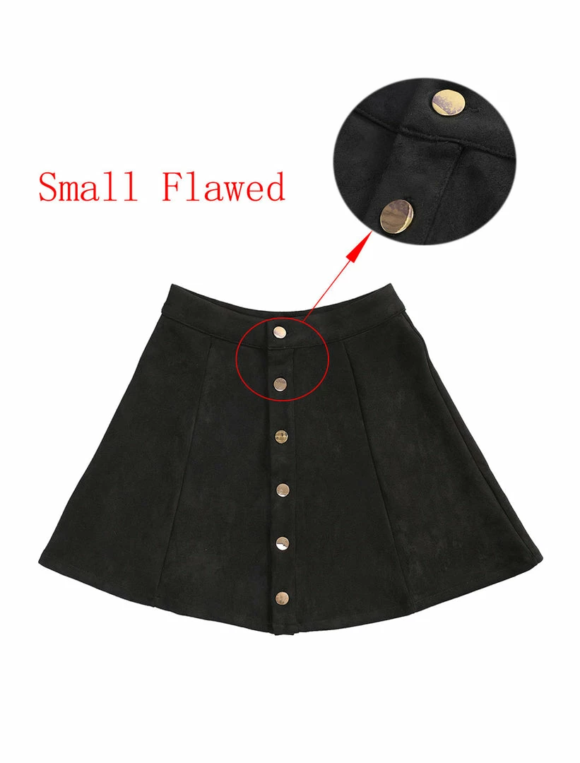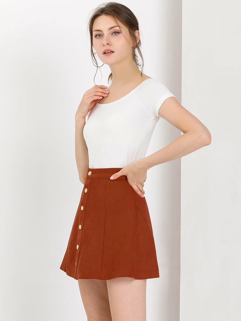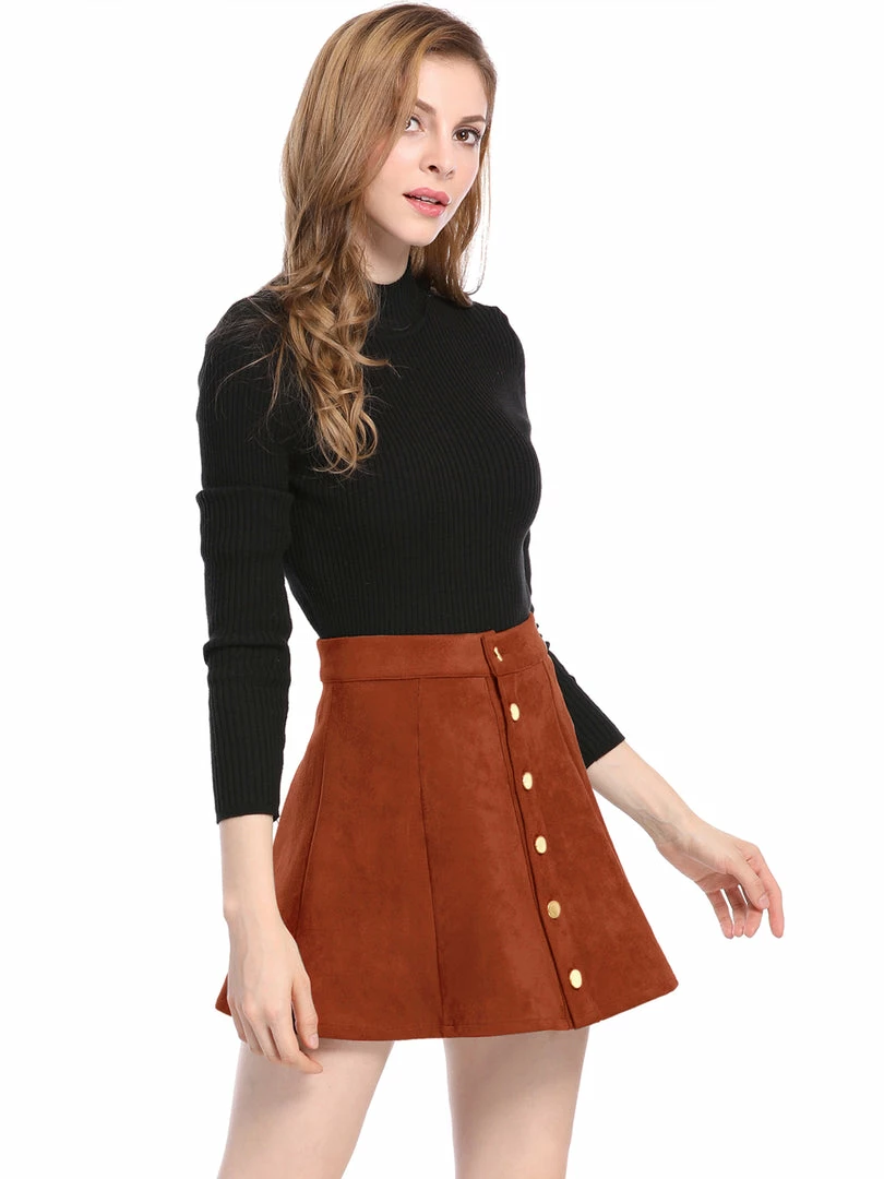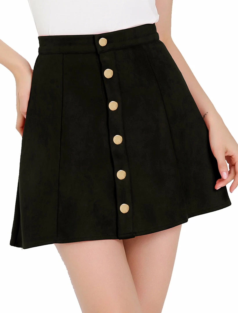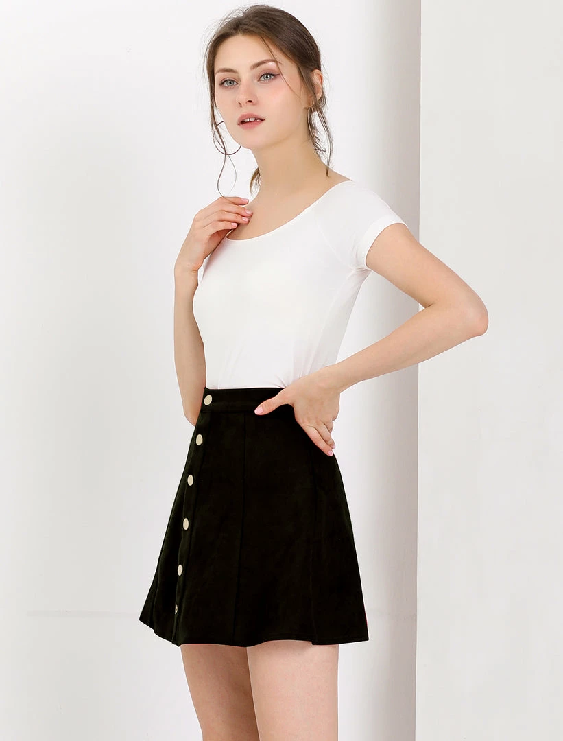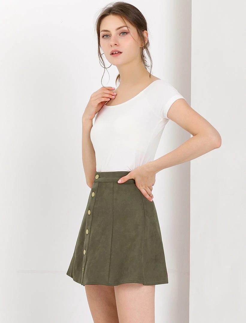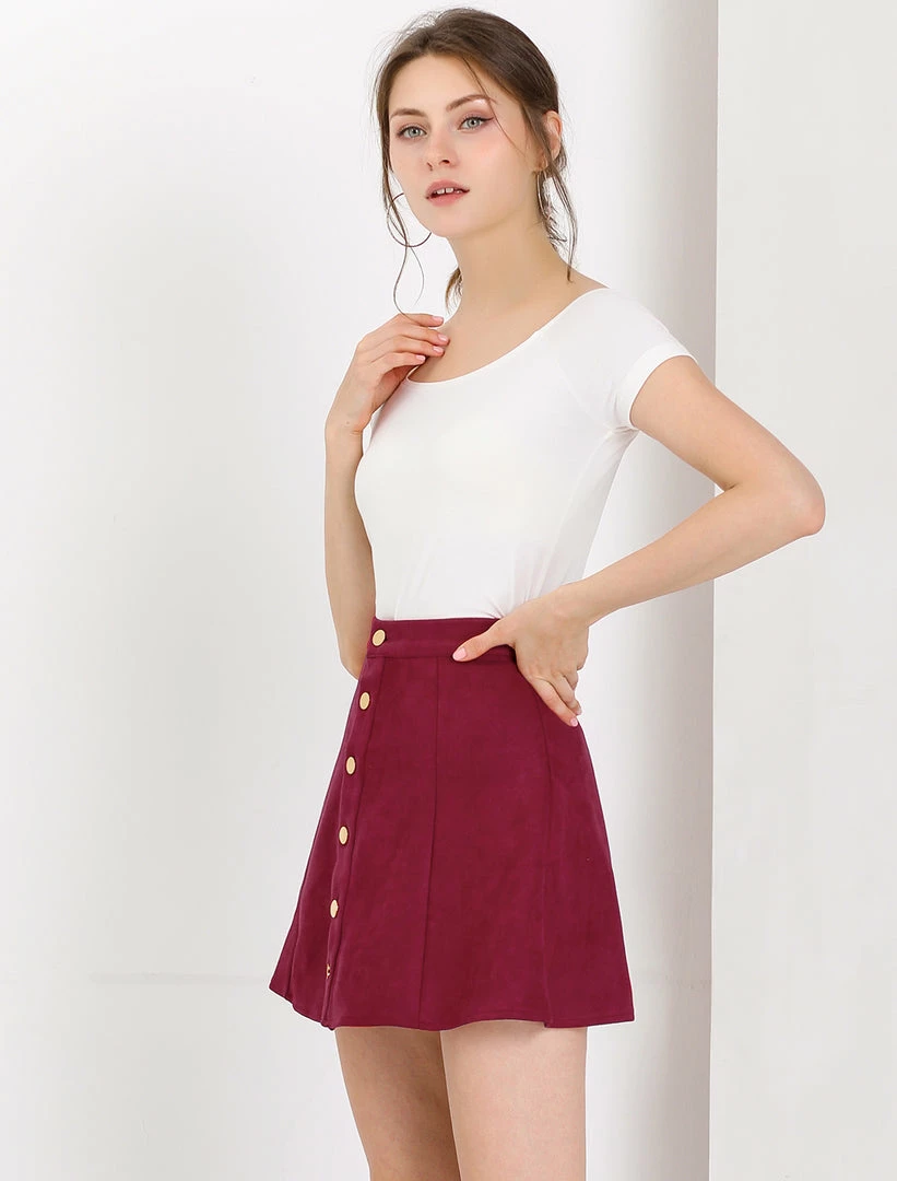• A button-front miniskirt made from supple faux suede gives off feminine mellow attitude while showing off plenty of leg.