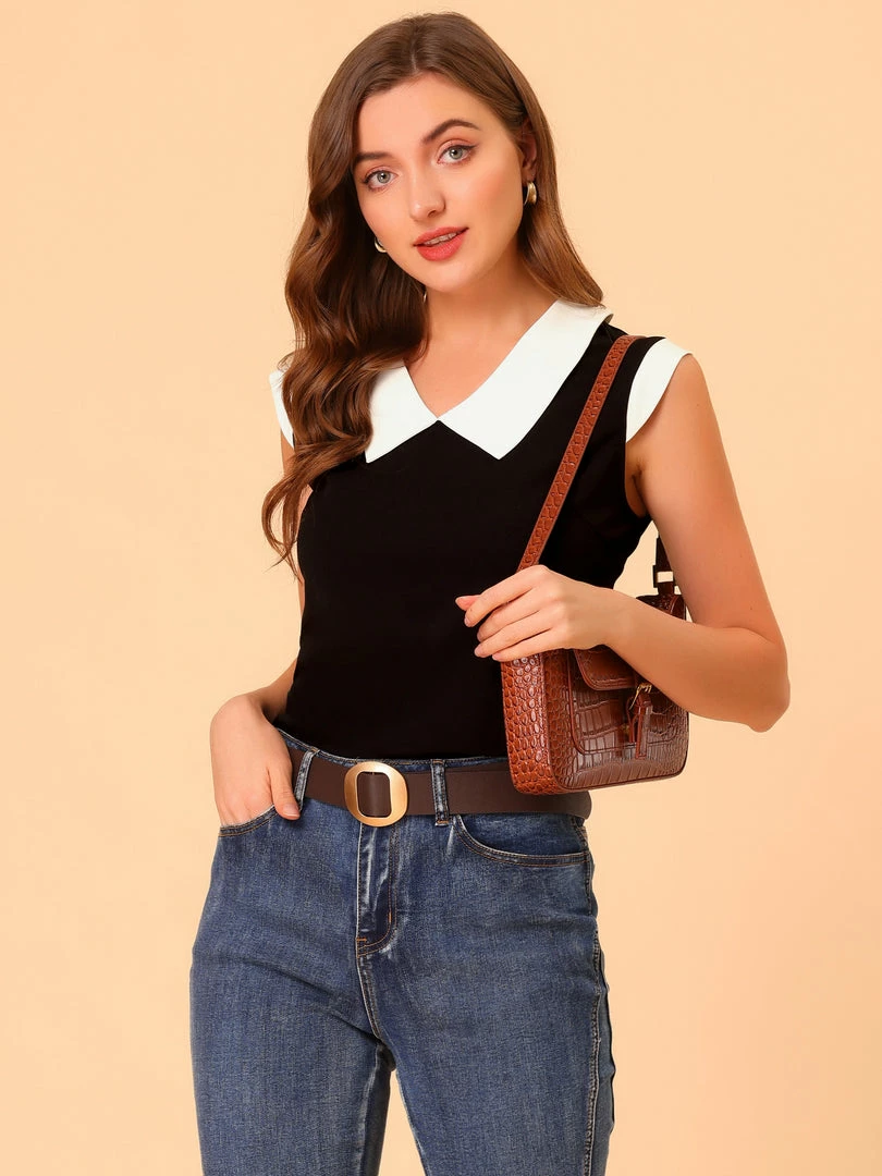 Allegra K Women’s Flat Collar Contrast Collar Stretchy Cap Sleeve Casual T-shirt