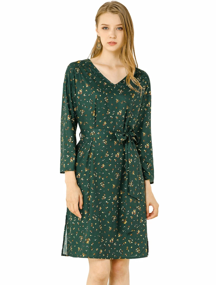 Allegra K Women’s Floral Belted 3/4 Sleeve V Neck Ruched Chiffon Midi A-Line Dress