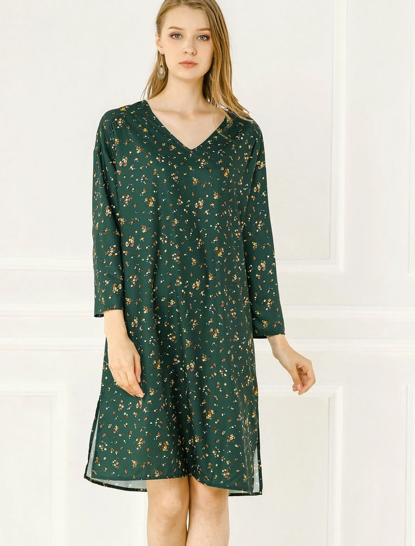 - This nice midi dress is complete with floral print, 3/4 sleeve, belted, V-Neck, and ruched detail on shoulder.