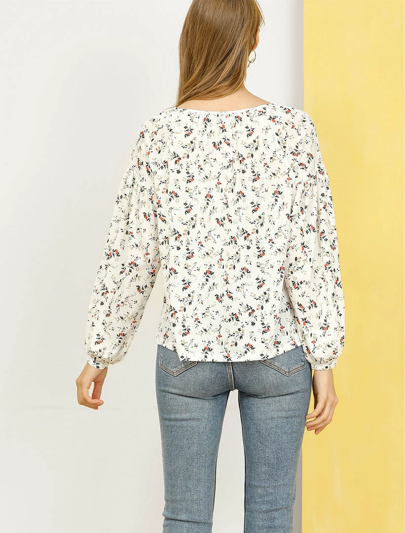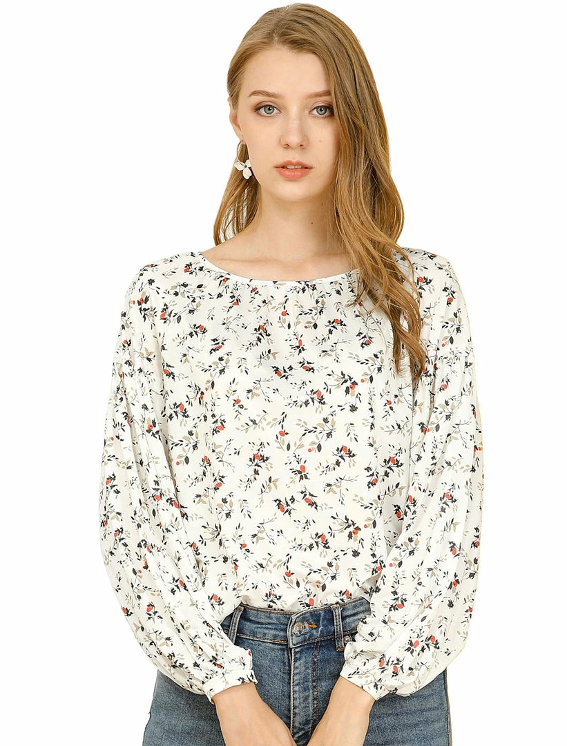 Allegra K Women’s Floral Bishop Long Sleeves Round Neck Casual Blouse Top