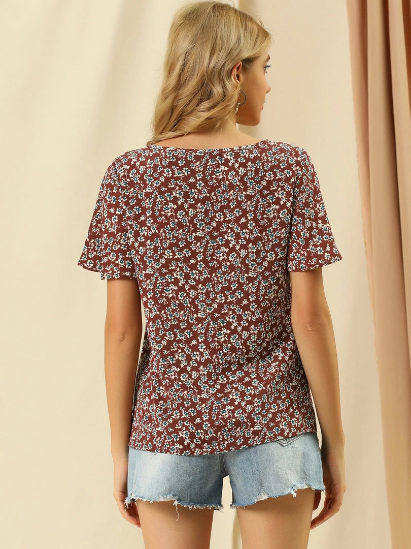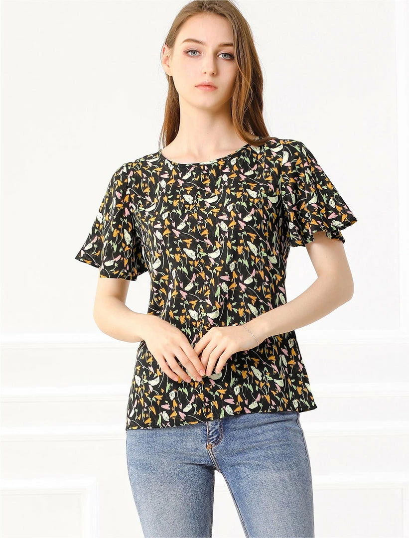 Allegra K Women’s Floral Butterfly Short Sleeve Round Neck Casual Chiffon Blouse Tops