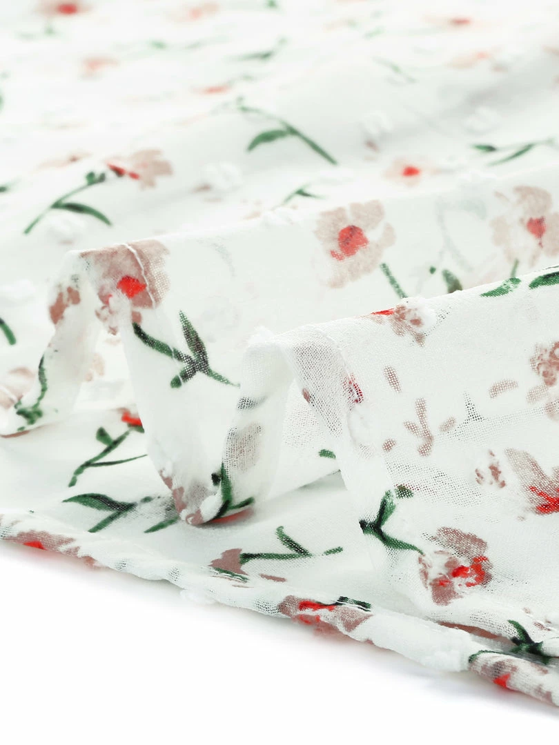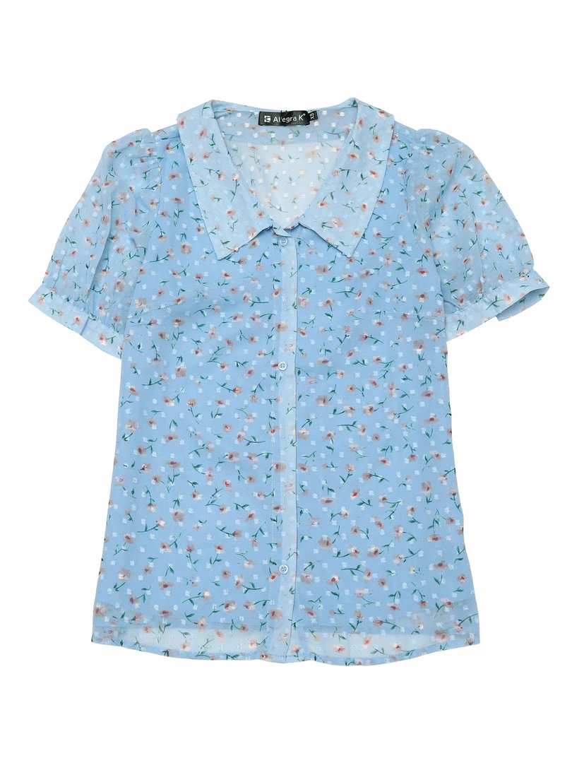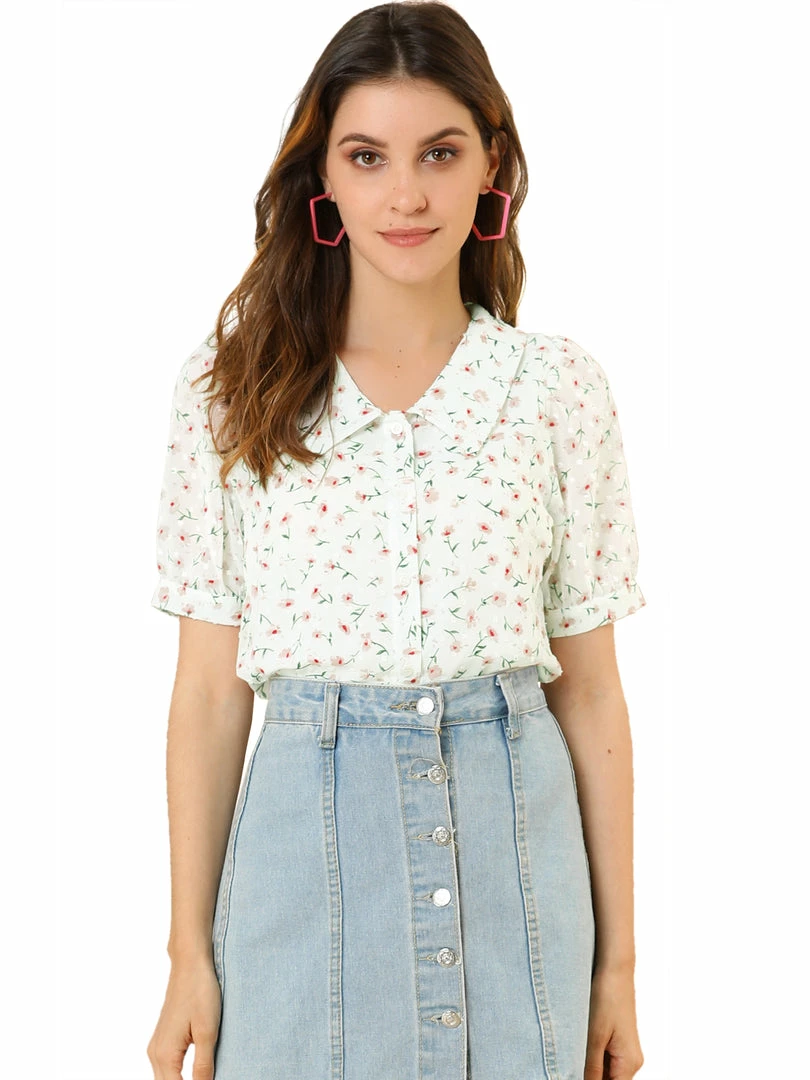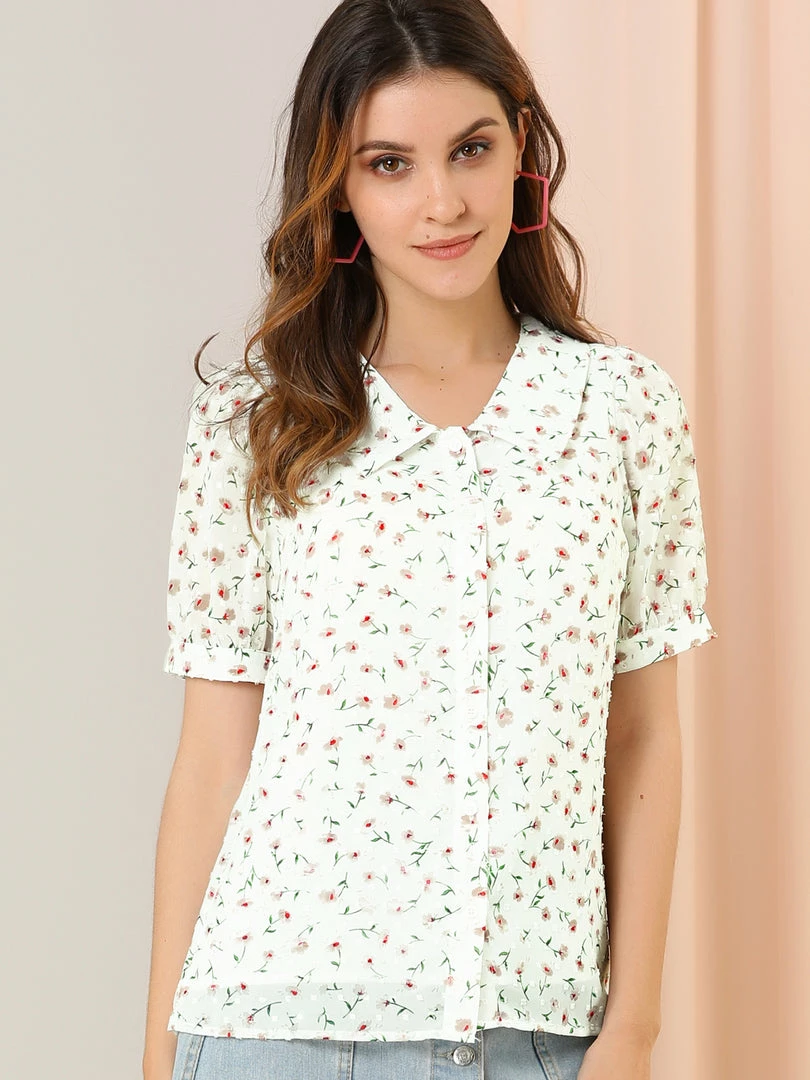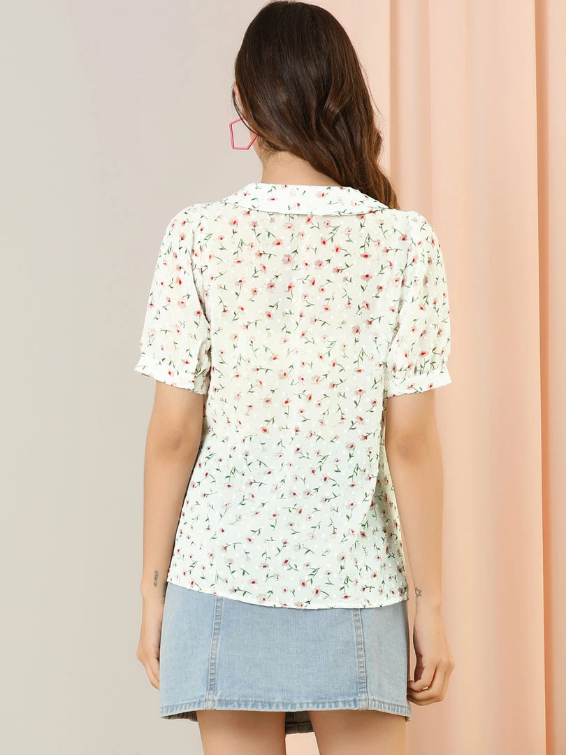 Allegra K Women’s Floral Button Down Collar Semi Sheer Sweet Puff Sleeve Blouse Shirt