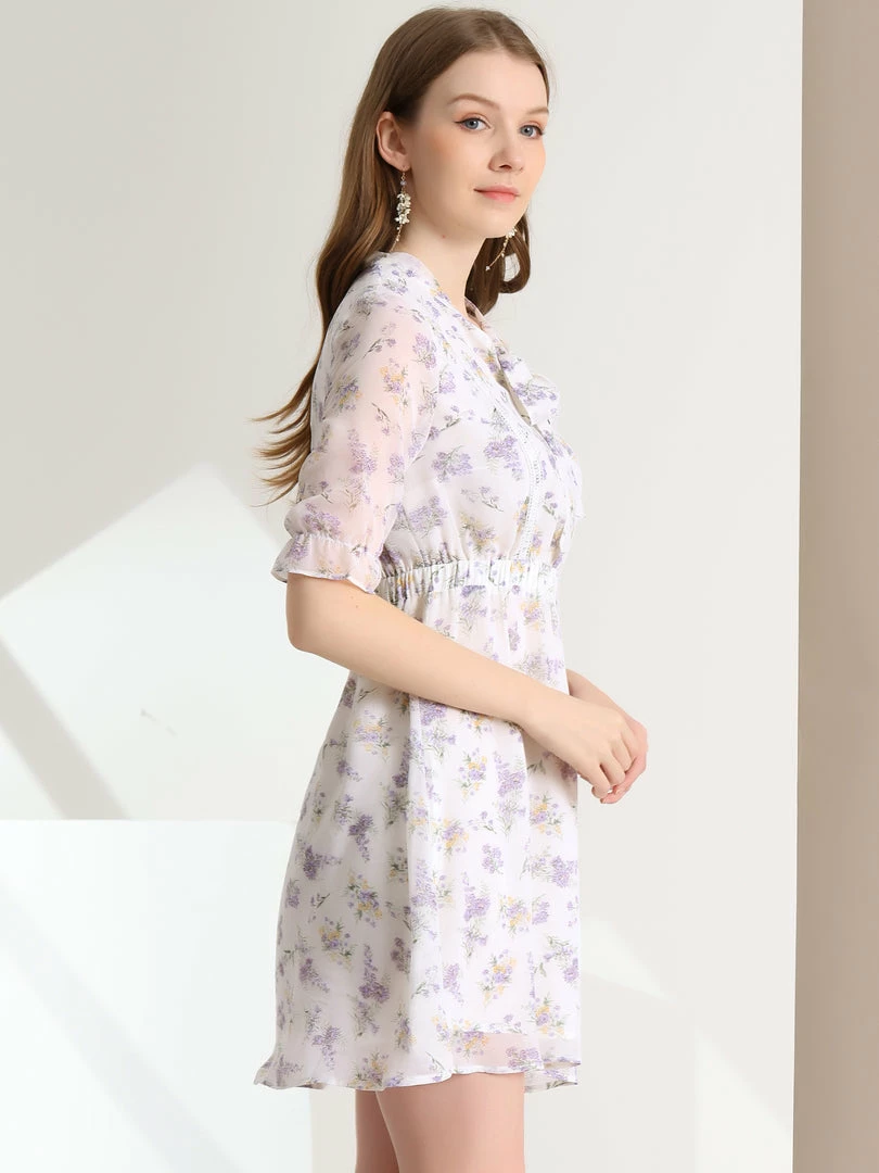 Women’s Ruffle Sleeve Tie Neck Lace Decor Elegant A-Line Floral Chiffon Dress.