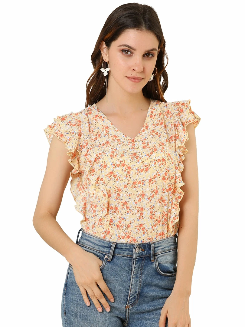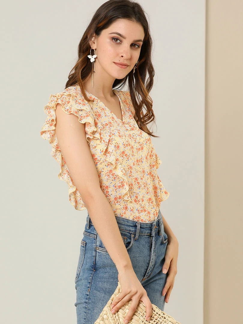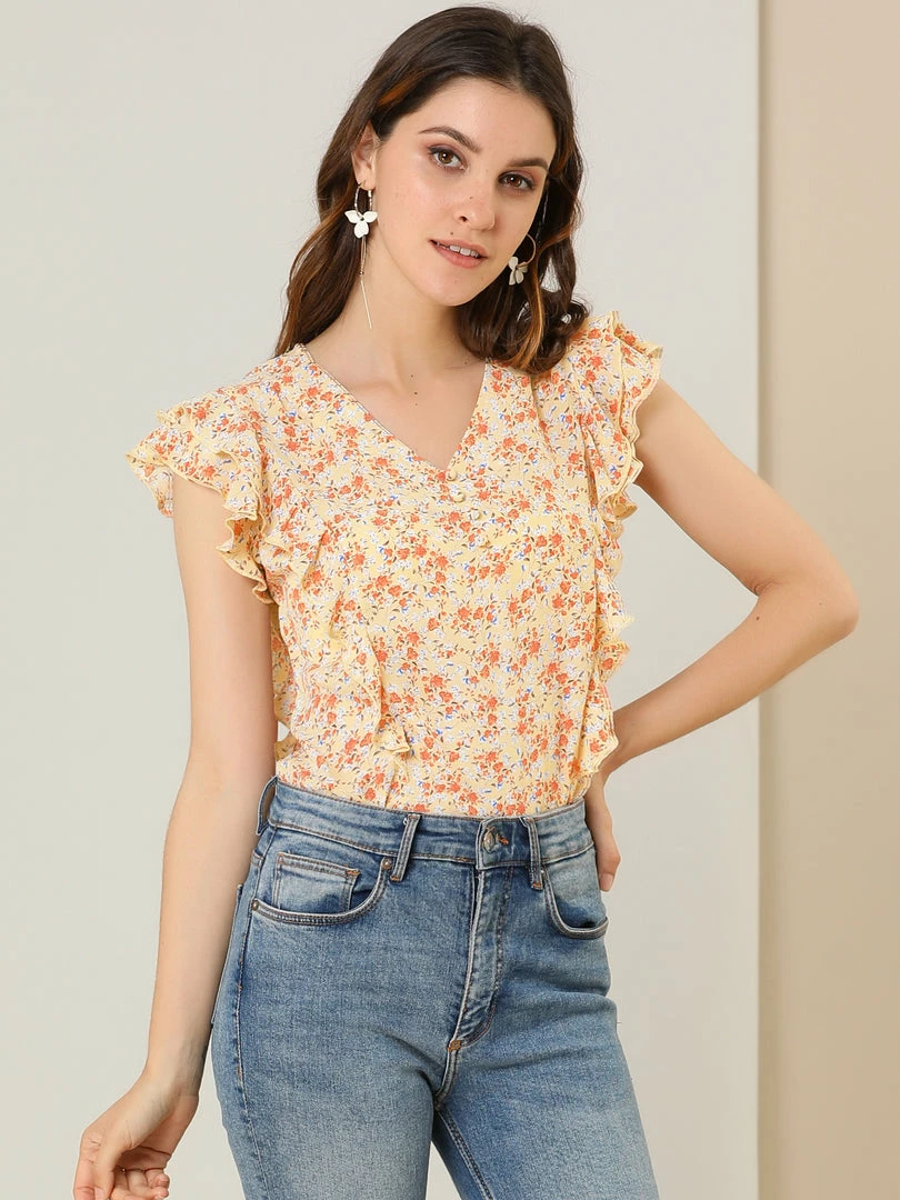 • Floral print breezy blouse with fluttery cap sleeves and sophisticated woven top complete with a flattering V-neck