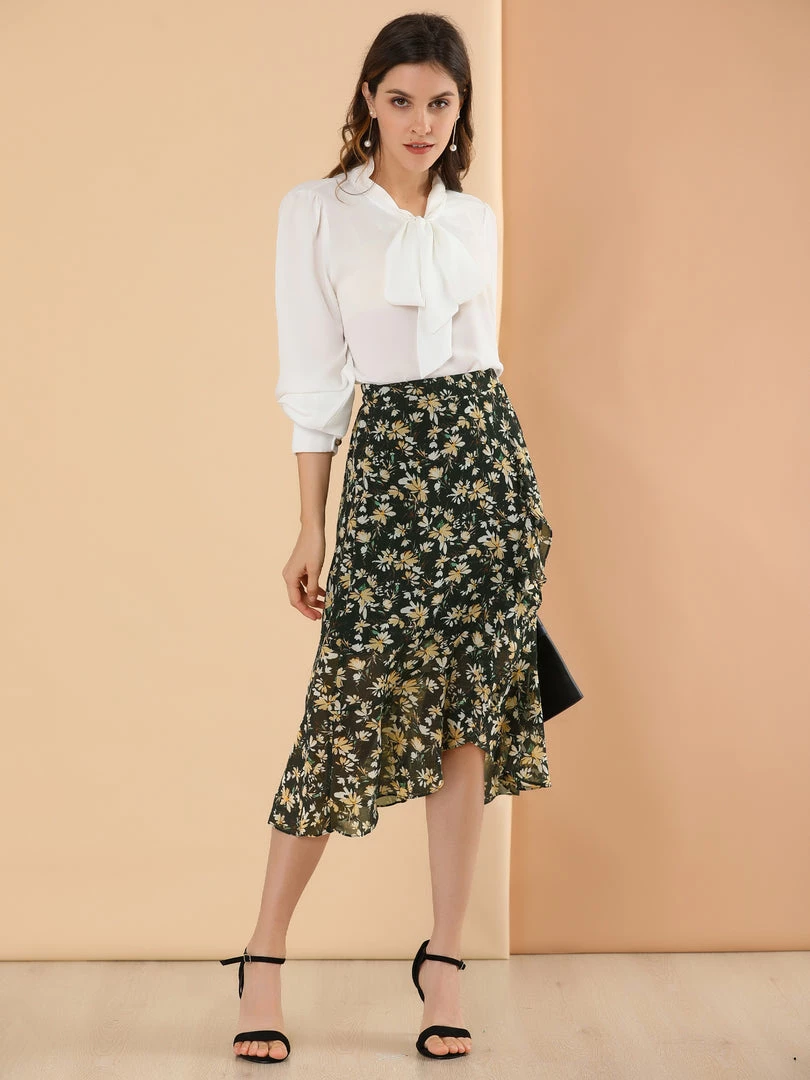 Allegra K Women’s Floral High Waist Faux Wrap Ruffle Midi Skirt