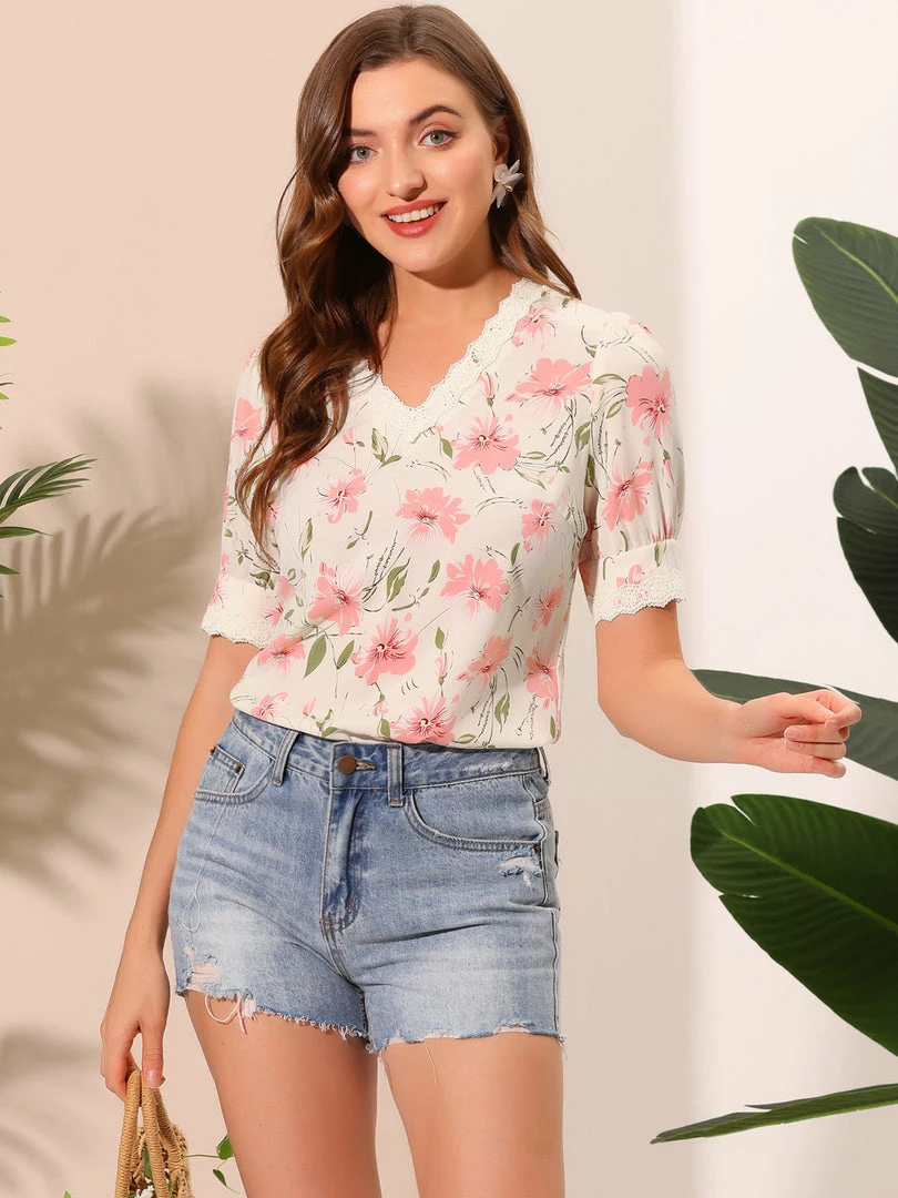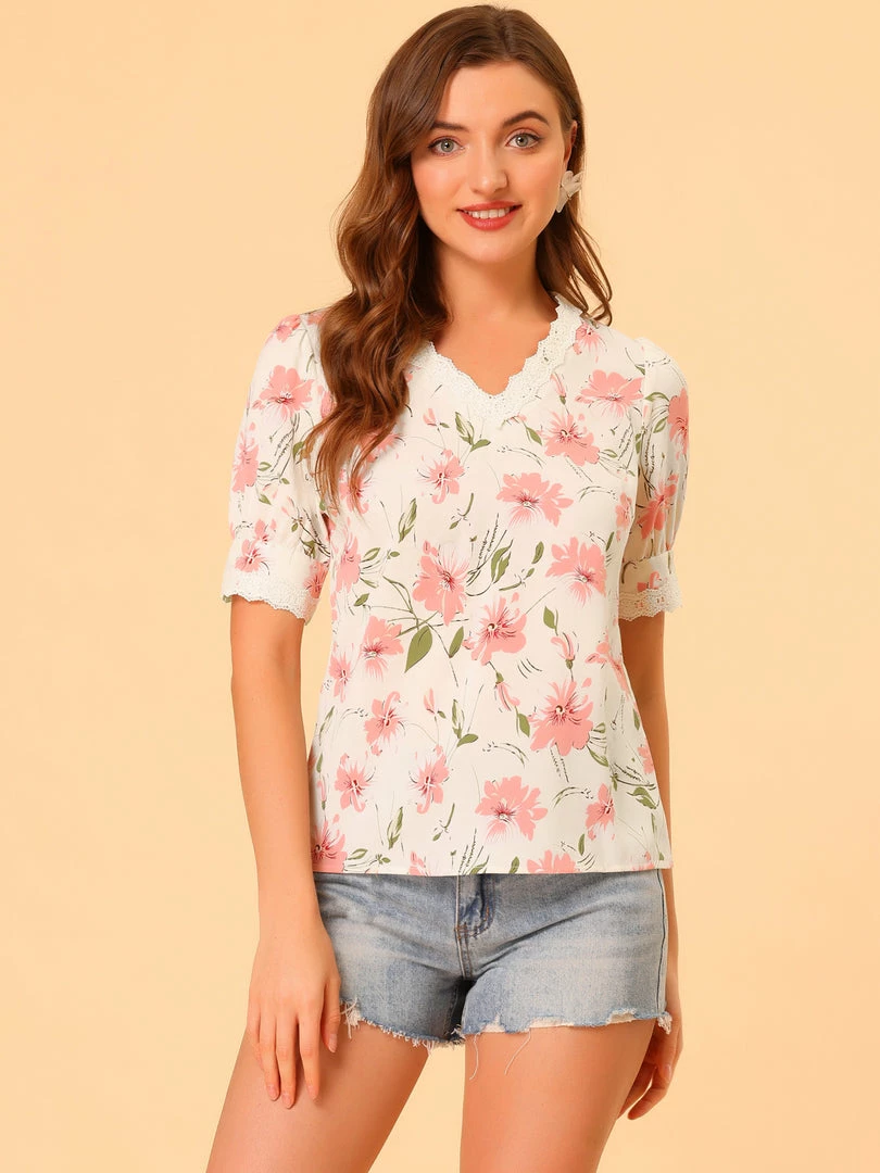 Allegra K Women’s Floral Lace Trim V Neck Summer Blouse Top