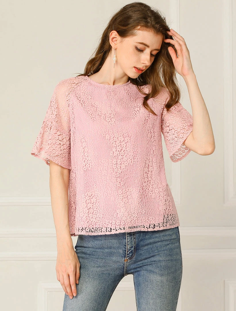 Allegra K Women’s Floral Lace Trumpet Raglan Sleeves Round Neck Blouse Top