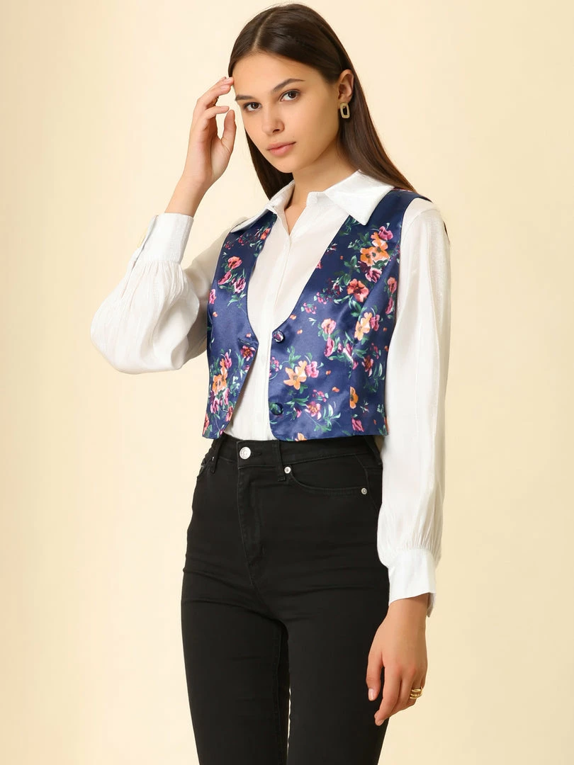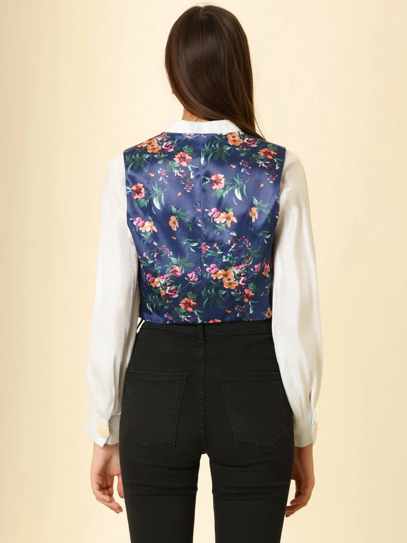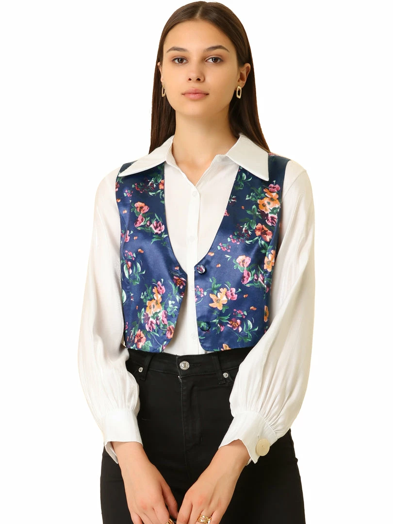 Allegra K Women’s Floral Pattern Button Closure Satin Waistcoat Vest