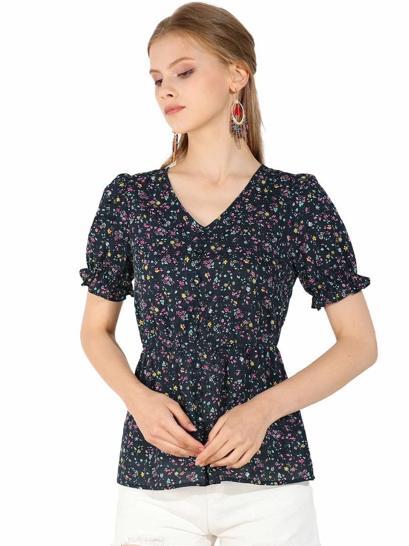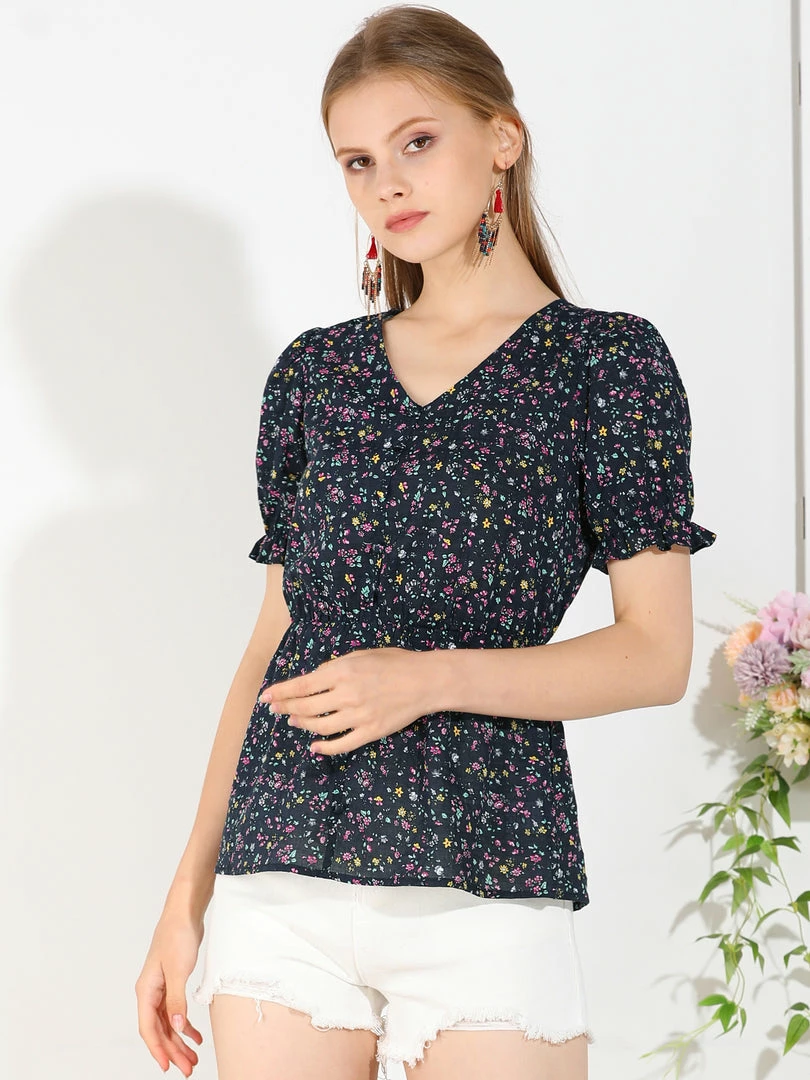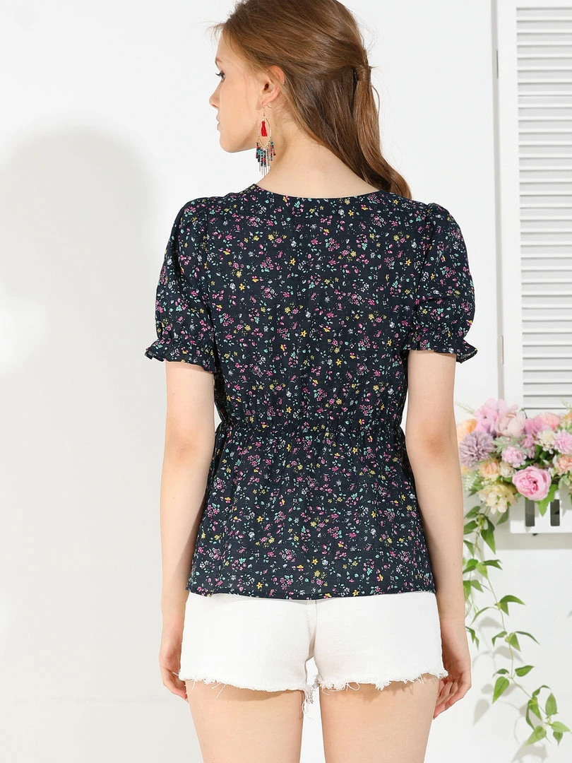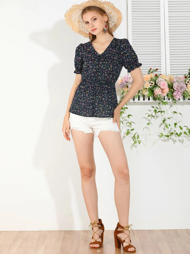 Allegra K Women’s Floral Peplum Top Ruffle Hem Puff Sleeve V Neck Summer Blouse