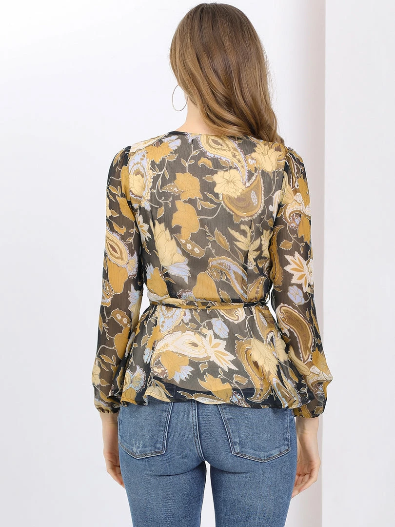 Allegra K Women’s Floral Peplum Top V Neck Chiffon Long Sleeves Shirt Blouse