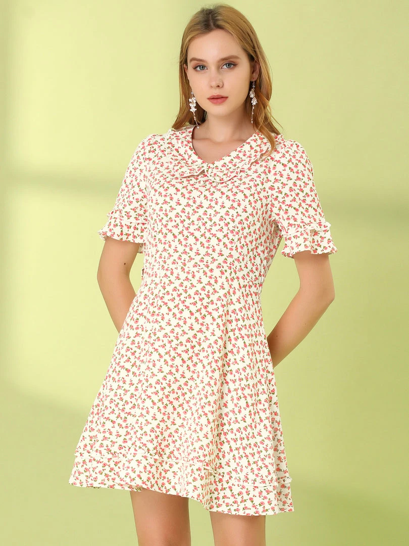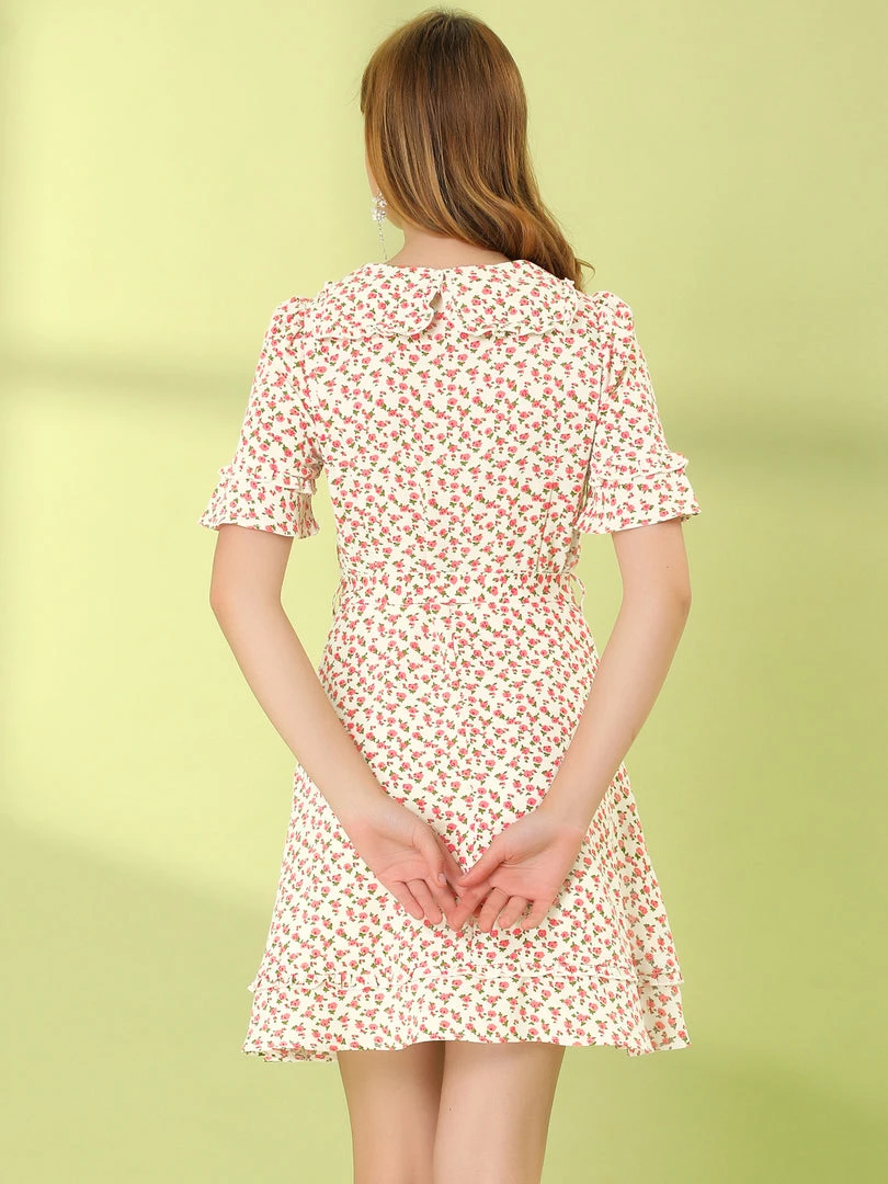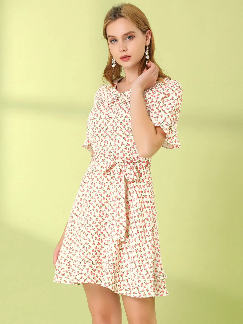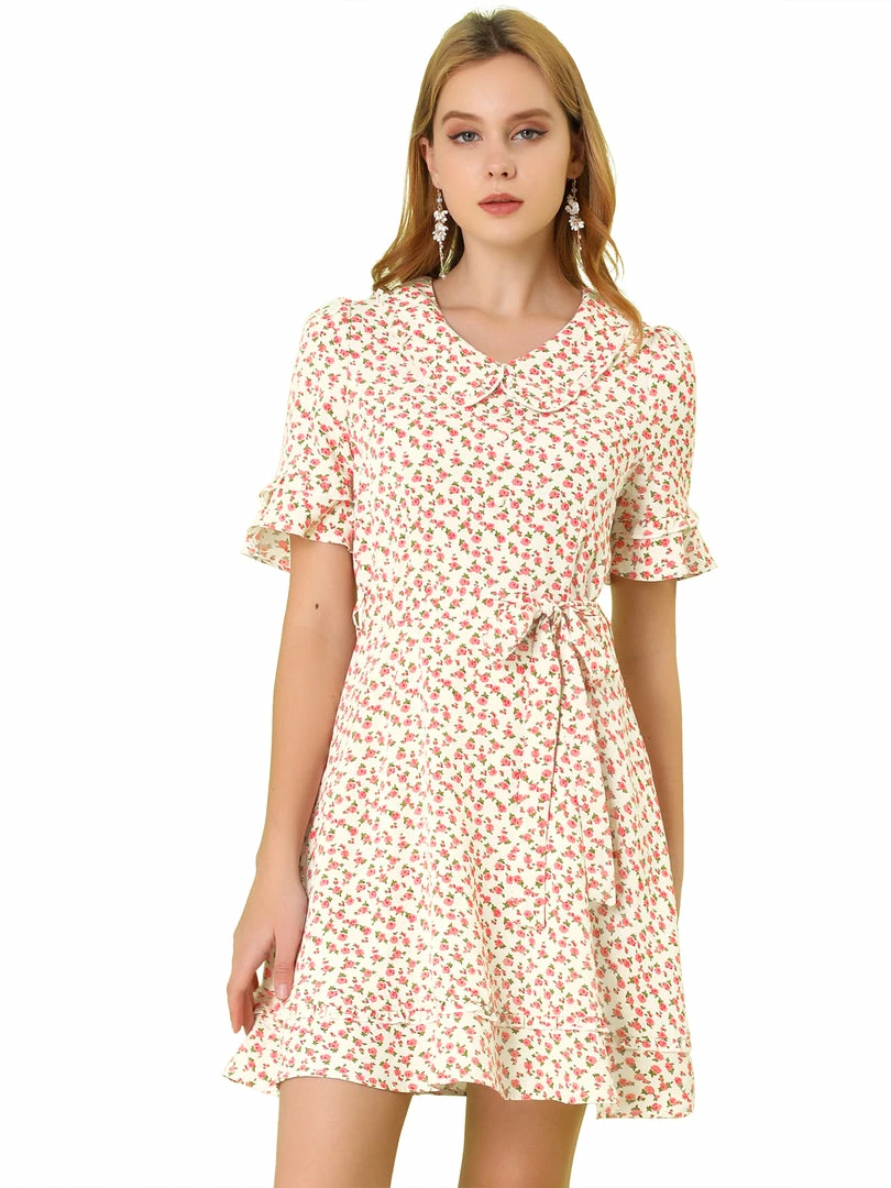 Allegra K Women’s Floral Peter Pan Collar Short Sleeve Belted Flare Ruffle Dress