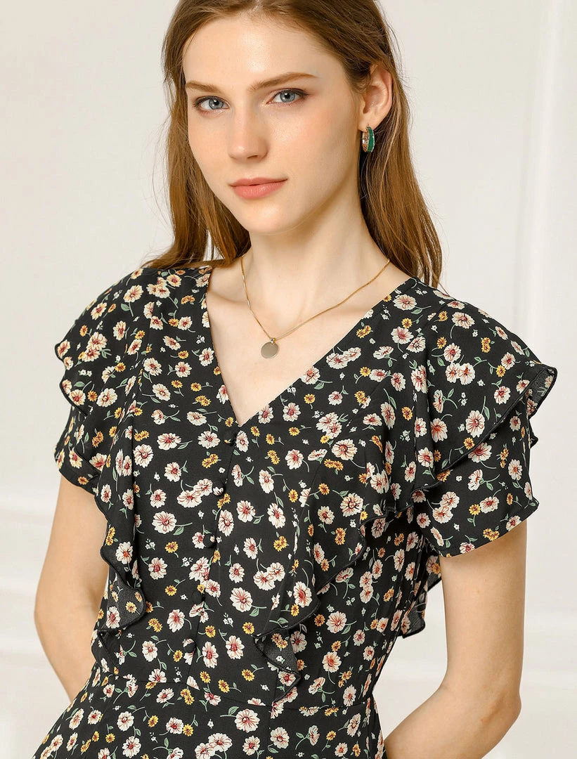 • Featuring a black floral print with V neck, buttons decor front, short sleeves and ruffled design.