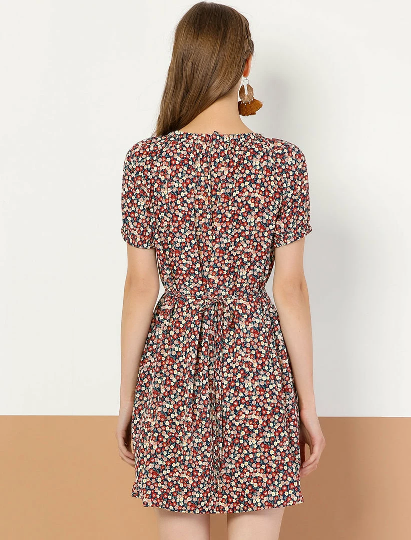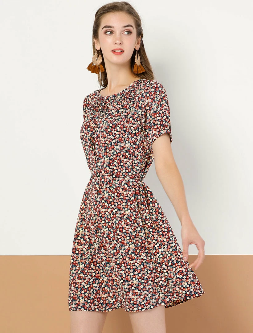 Allegra K Women’s Floral Print Elastic Neck Short Sleeve Loose Belted Dress