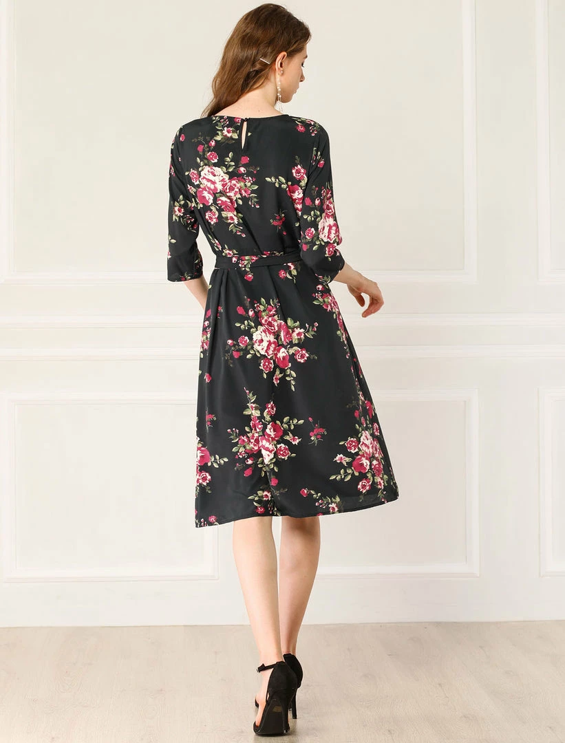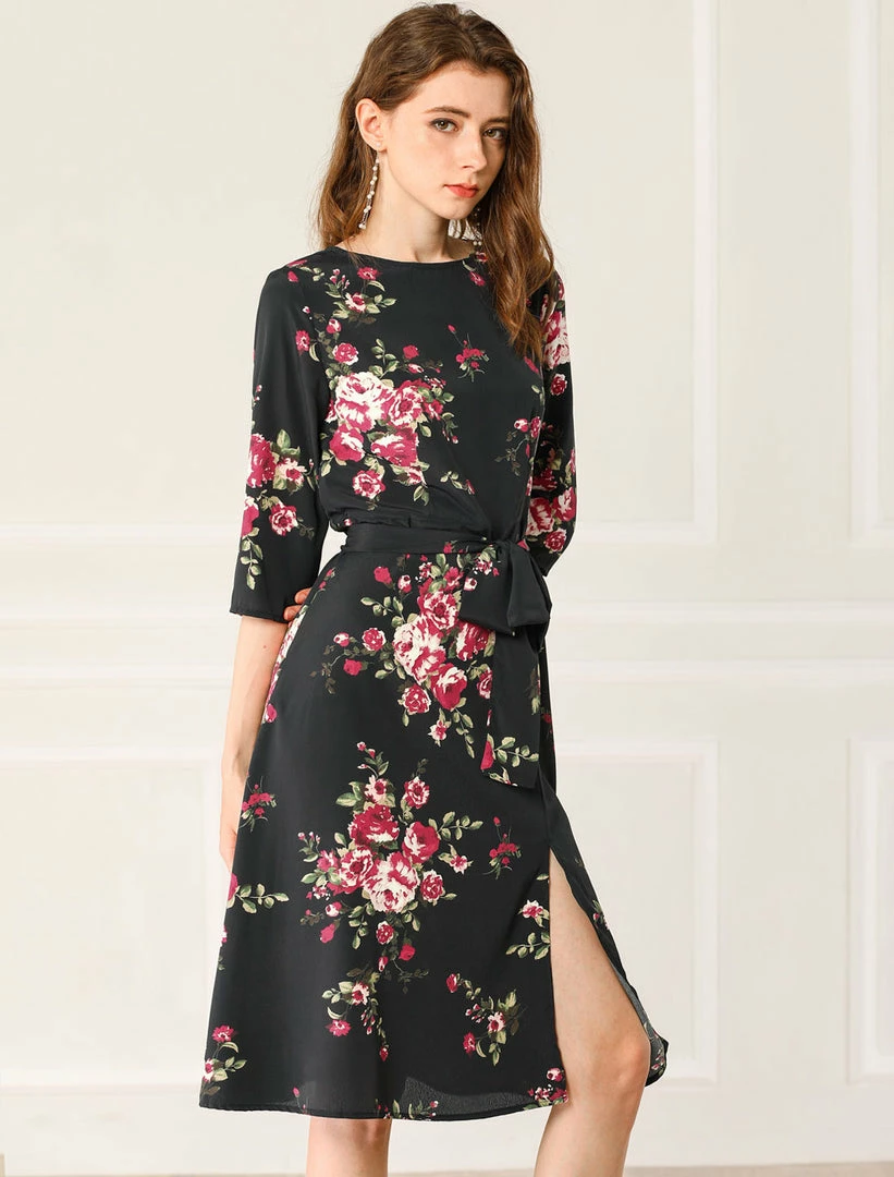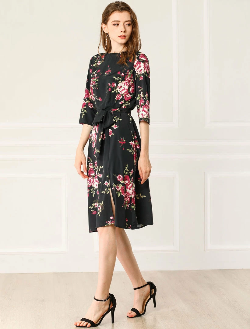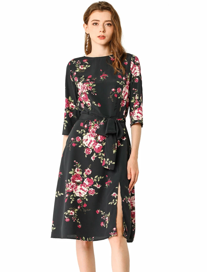 Allegra K Women’s Floral Print Front Split Back Keyhole Self Tie Round Neck Dress