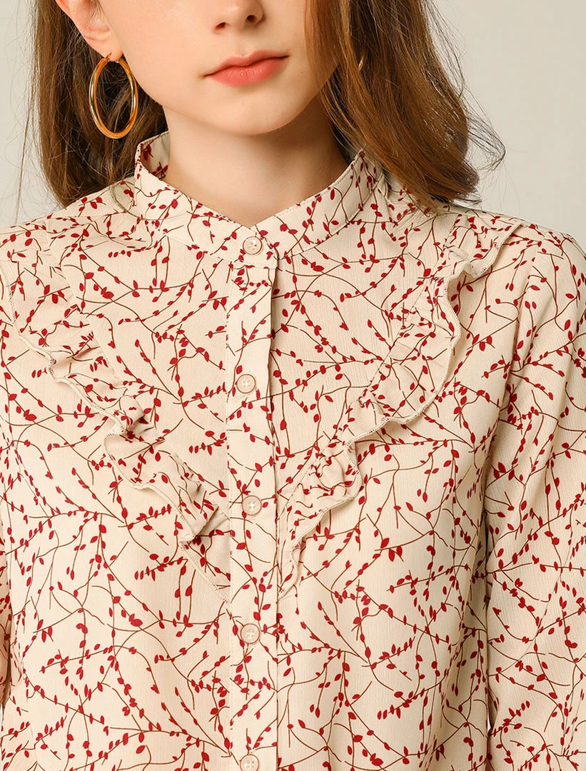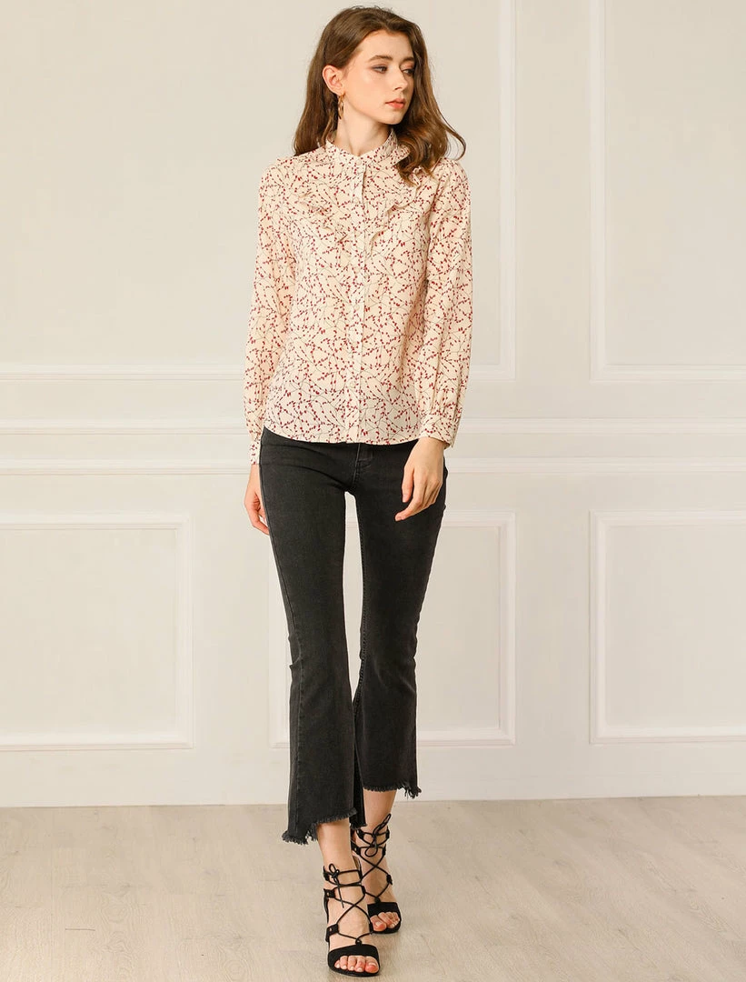 Allegra K Women’s Floral Print Long Sleeve Casual Shirts Ruffle Chiffon Blouse